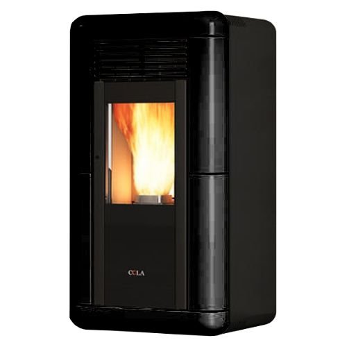 Stufa a pellet colore nero con cornice anteriore, top e frontalino in maiolica e rivestimento in acciaio verniciato.