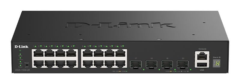 Switch Stand-Alone D-Link DGS-1530-20 16 PORTS GE + 4 10G SFP+ DGS-1530-20DGS-1530-20/E. Tipo interruttore: Gestito, Livello del commutatore: L2. Tipo di porte RJ-45: Gigabit Ethernet (10/100/1000), Quantità di porte RJ-45: 8, Quantità porte USB 2.0: 1, Console port: RJ-45. Full duplex. Dimensioni tavola MAC: 16000 voci, Capacità di commutazione: 112 Gbit/s. Standard di rete: IEEE 802.3, IEEE 802.3ab, IEEE 802.3ae, IEEE 802.3u, IEEE 802.3x. Montaggio rack