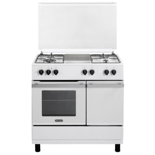 Cucina 90x60, estetica colore bianco, 4 fuochi gas, griglie smaltate nero opaco, griglia centrale in filo metallico, accensione sotto manopola, forno a gas statico, porta forno con doppio vetro interno estraibile, vano inferiore con pannello abbattibile,