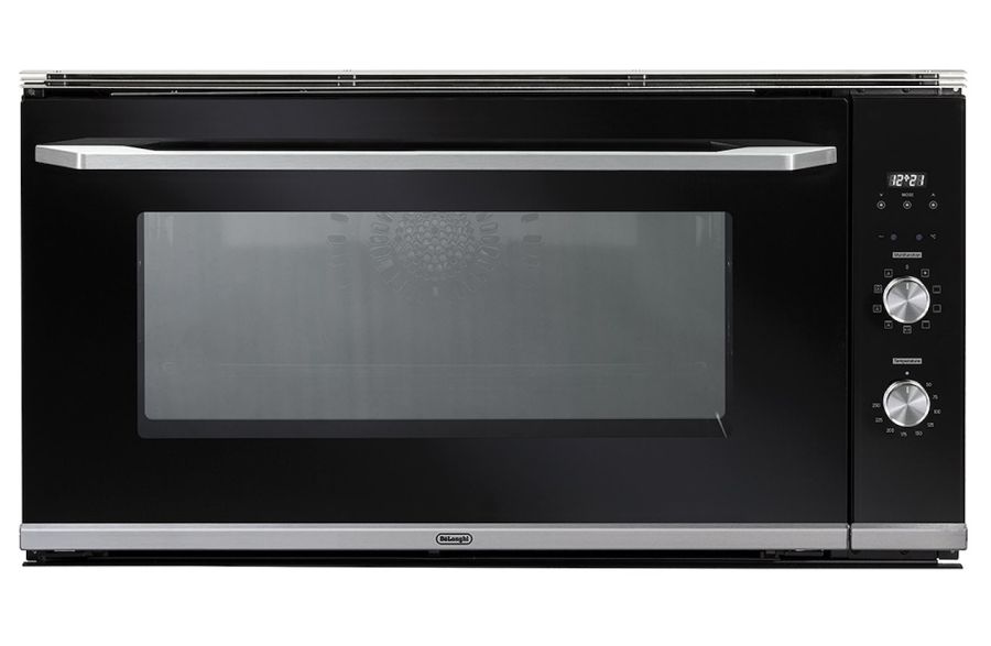 Forno elettrico multifunzione 90 cm, nero con profili metallo spazzolato, programmatore elettronico touch control, funzione termoventilata 3D, girarrosto, porta doppio vetro con ventilazione tangenziale, volume 87 lt, classe energetica A.