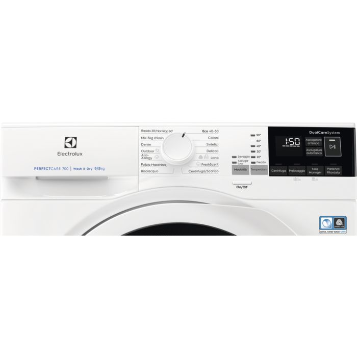 A Carica Frontale Electrolux EW7W495W LAVASCIUGA 9+5KG 1400G E OBLO' BIANCO GT0210625036La lavasciuga PerfectCare serie 700 lava e asciuga perfettamente i tuoi capi in un unico ciclo. Il sistema DualCare rileva il tipo di tessuto e il peso del carico e regola la temperatura e il movimento del cesto garantendo il trattamento ideale per ogni indumento.
