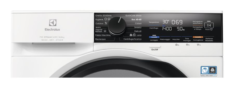 Lavasciuga - Carica frontale - Libera installazione (FS) - Capacità 9 Kg - Asciugatura 5 Kg - Classe energetica D - Classe energetica ciclo completo D - Con tasto partenza ritardata - Con funzione refresh - 14 programmi - Con Programma Vapore - Lava e asciuga in una volta o rinfresca con il vapore e risparmia fino al 96% di acqua* Lava, asciuga o rinfresca, tutto in un'unica macchina. Con la lavasciuga SteamCare 700 puoi lavare e asciugare anche la lana senza restringerla. Oppure usa il vapore invece del lavaggio completo, che richiede solo 25 minuti e consente di risparmiare fino al 96% di acqua*. *Basato su test interno di consumo d?acqua confrontando Vapore Refresh con il programma di lavaggio completo Delicati 30 C° utilizzando un carico di 1kg. Vapore Refresh ? rinfresca i tuoi capi con il vapore e indossali nuovamente, risparmiando fino al 96% di acqua* Il programma Vapore Refresh 25 min è adatto per capi delicati e utilizza meno acqua rispetto al normale lavaggio. Per una sensazione ancora più fresca, è possibile aggiungere Electrolux Steam Fragrance. *Basato su test interno di consumo d?acqua confrontando SteamRefresh con il programma di lavaggio completo Delicati 30 C° utilizzando un carico di 1kg. DualCare®, nessun restringimento durante lavaggio e asciugatura, anche per lana* DualCare® consente di lavare e asciugare con sicurezza. Questa macchina certificata Woolmark Blue, con temperature e movimenti del cesto su misura, lava e asciuga efficacemente anche giacche da esterno e maglioni di lana senza alcun restringimento.* *Comparabile con l?asciugatura in piano OneGo 20/60min ? lava e asciuga in solo un'ora Con OneGo 20/60min, puoi lavare e asciugare piccoli carichi misti in un'ora o lavare in soli 20 minuti. Goditi la cura rapida e conveniente dei tuoi capi quando sei di fretta. SensiCare+, risparmia fino al 60% di tempo, acqua ed energia nell'asciugatura* e fino al 40% nel lavaggio** La Tecnologia SensiCare+ rileva le dimensioni del carico e regola il programma per risparmiare fino al 60% di tempo, acqua ed energia durante l?asciugatura* e fino al 40% durante il lavaggio.** Questo garantisce una cura precisa non solo per il lavaggio ma anche per l'asciugatura. *Basato su test interni sul consumo di tempo, acqua ed energia di un carico di 1kg e il carico massimo utilizzando il ciclo Cotoni in asciugatura 30°C ottimizzato con SensiCare+. **Basato su test interni sul consumo di tempo, acqua ed energia di un carico di 1kg e il carico massimo utilizzando il ciclo Cotoni 30°C ottimizzato con SensiCare+. Il cesto CareDrum è delicato sui tessuti Il cesto CareDrum consente agli indumenti di scivolare delicatamente grazie al suo design a cuscinetto rialzato. Grazie al design unico del cesto, è delicato sui tuoi vestiti.