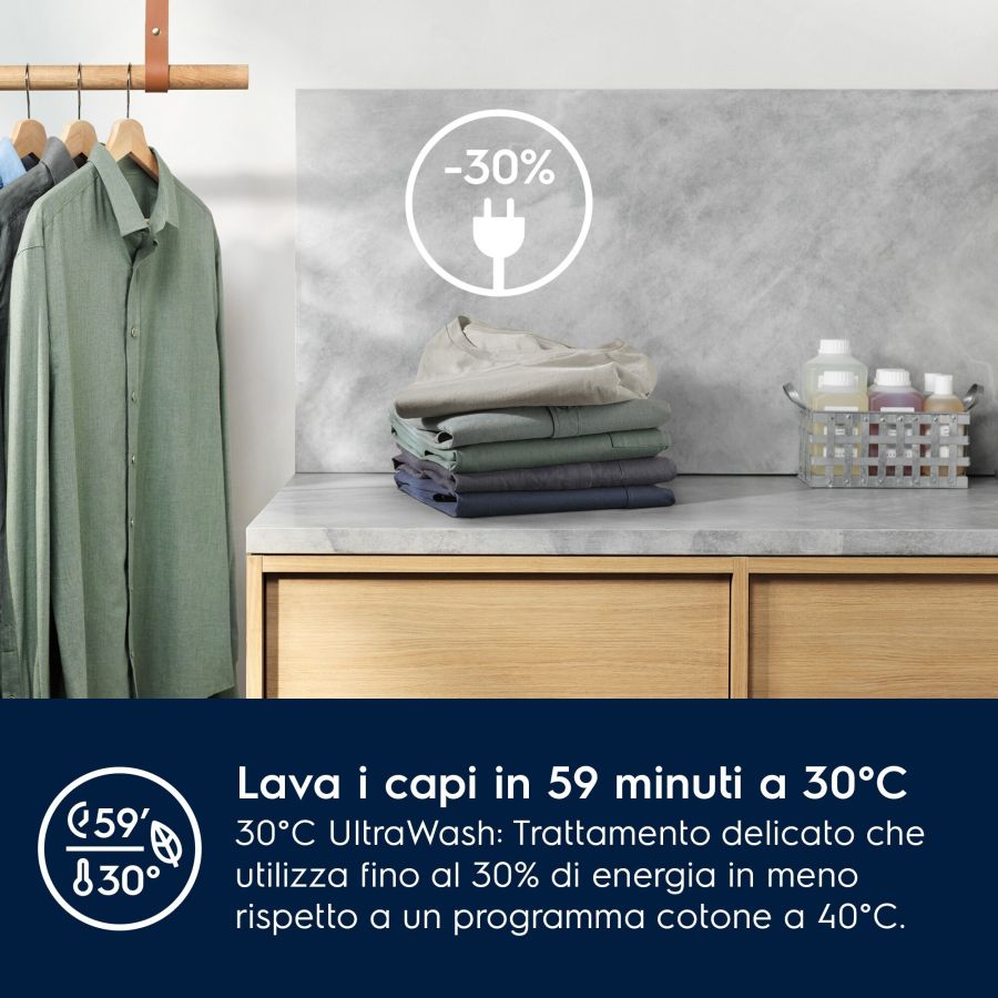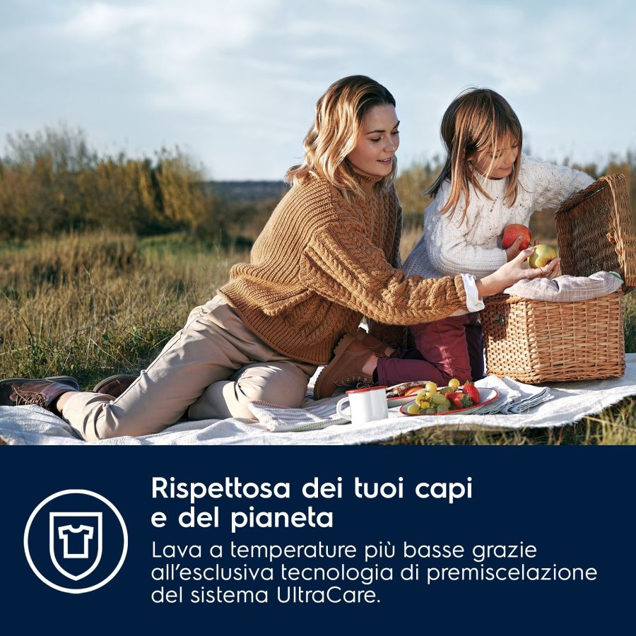 La lavatrice PerfectCare 800 con il sistema UltraCare si serve della tecnologia di premiscelazione per attivare il detergente. Ciò contribuisce alla pulizia degli indumenti a temperature ridotte, con meno energia, per una maggiore durata dei tuoi capi.