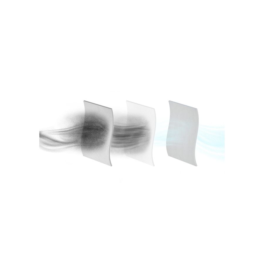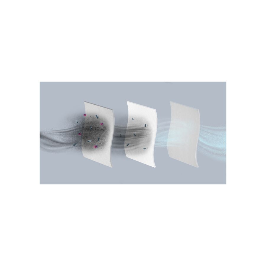 Il materiale sintetico di questo sacchetto per aspirapolvere filtra fino al 99% di particelle dalle dimensioni pari a 1 micron (vale a dire 15 volte più piccole del diametro di un capello umano). Filtra l'aria il 40% più efficacemente di un sacchetto di carta tradizionale e consente di eliminare particelle aeree quali allergeni ed alcune tipologie di batteri.