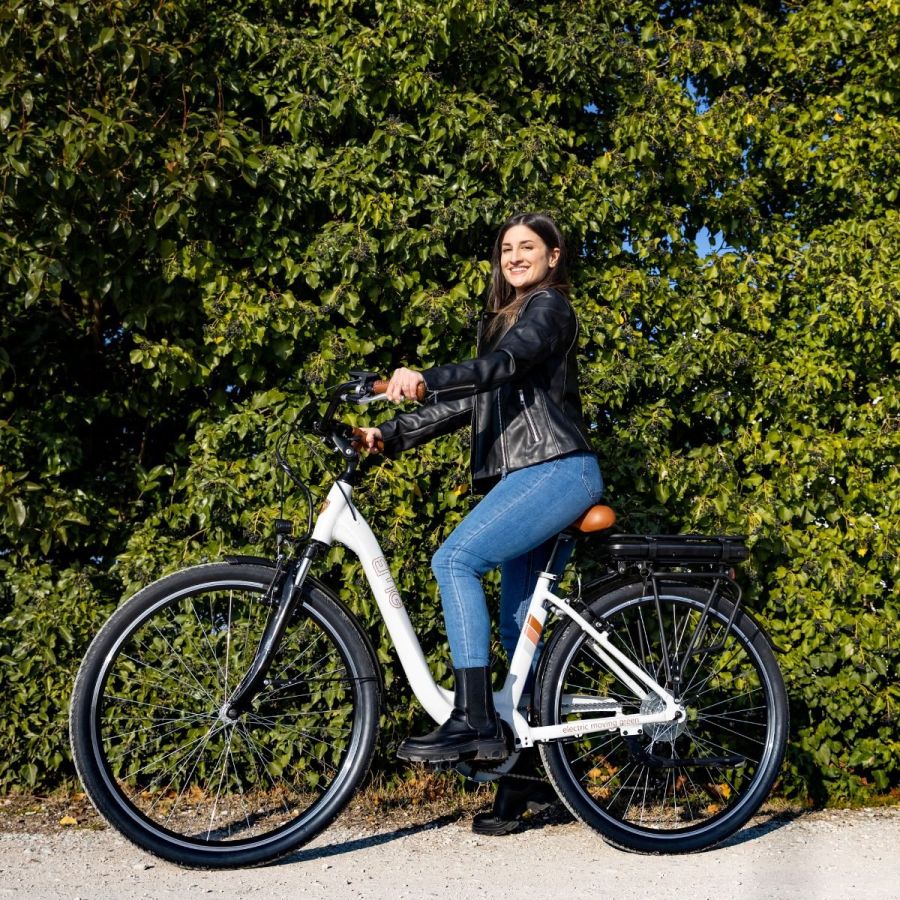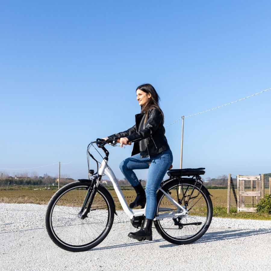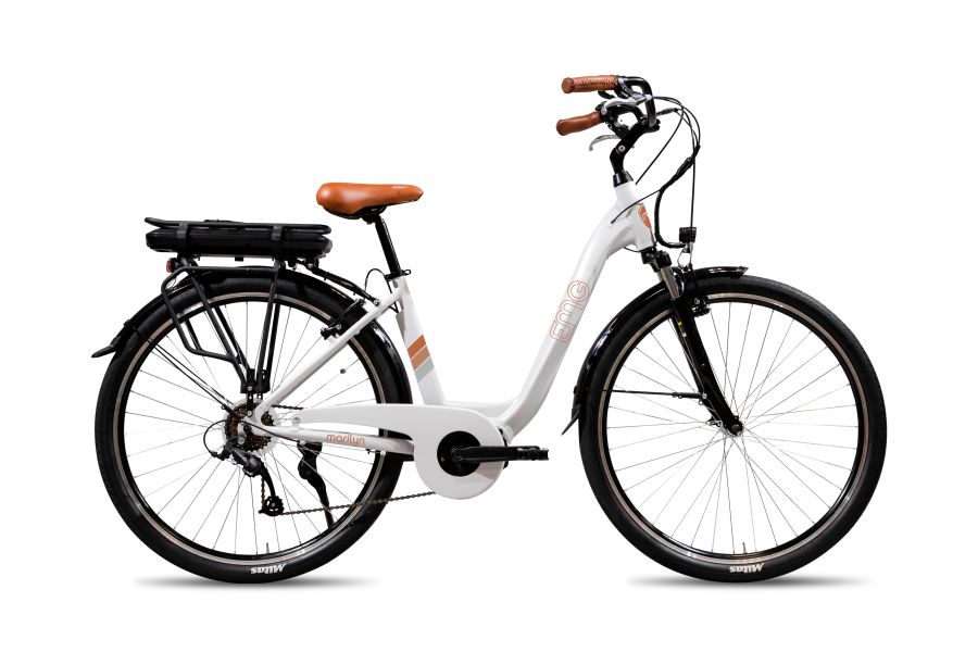 E-BIKE Emg 28CMY06 ECO163160Una combinazione di eleganza, grazie alle linee vintage del telaio e al colore bianco ghiaccio, di design e di tecnologia per la bicicletta elettrica EMG Marilyn. Ideale per chi cerca una mobilità eco-friendly dallo stile unico!