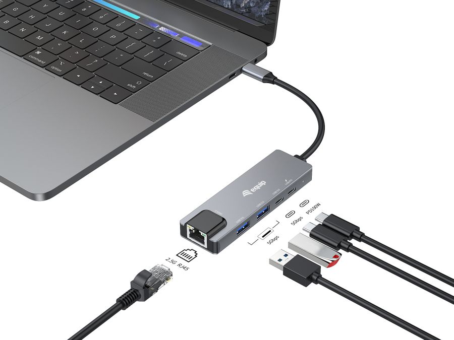 USB Equip - ADATTATORE MULTIFUNZIONALE 5 in 1 USB 3.2 Gen 2,5GbE, 2x USB-A, 1x USB-C, 100W 133496"L'adattatore Equip 133496 da USB-C a 2,5G Ethernet è progettato per migliorare la produttività con una connessione affidabile e ad alta velocità e molteplici opzioni di espansione. Dotato di una porta 2,5 Gigabit Ethernet, consente un accesso a Internet ultraveloce e stabile, ideale per gestire attività ad alta intensità di dati come trasferimenti di file di grandi dimensioni, riunioni online, streaming e giochi.