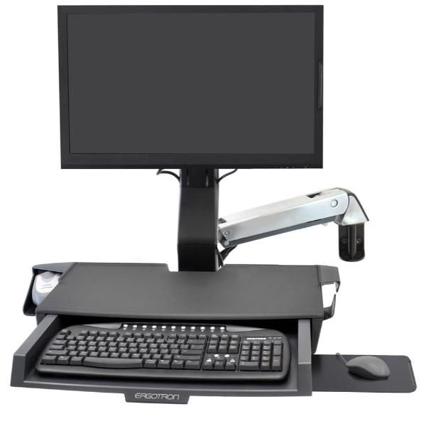 Questo braccio combinato per posizione seduta/eretta sostiene un monitor, un lettore di codici a barre, una tastiera, un poggiapolsi e un mouse, oltre a un piano di lavoro robusto: il tutto sullo stesso braccio ad altezza regolabile, per garantire un?adattabilità ergonomica che contribuisce a flussi di lavoro ottimali (e al comfort).