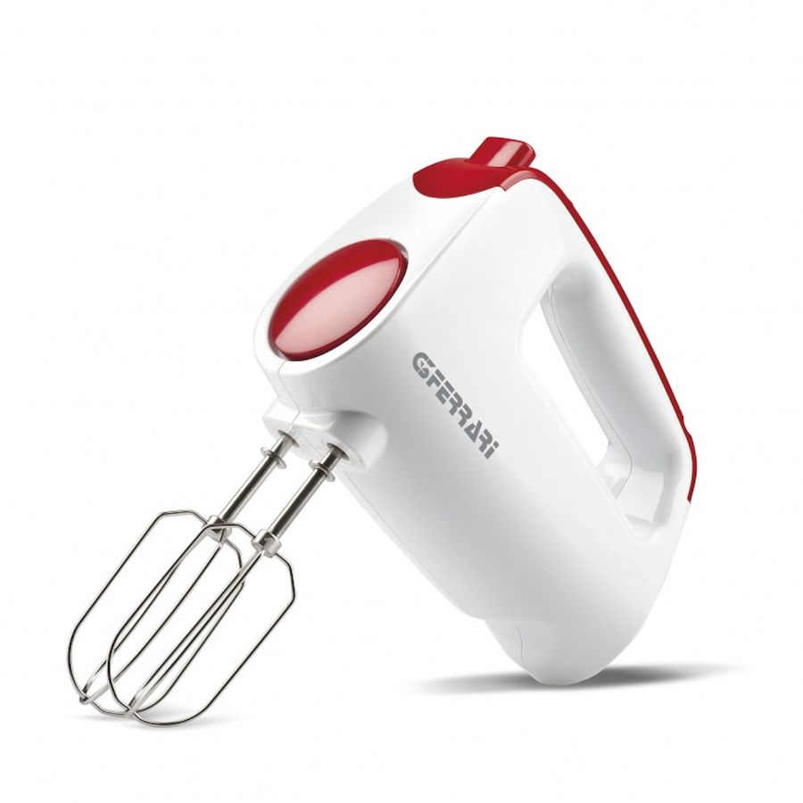 Sbattitore elettrico, 6 velocità, potenza 250W, fruste sbattitori e ganci per impastare, funzione turbo, tasto espulsione utensili.