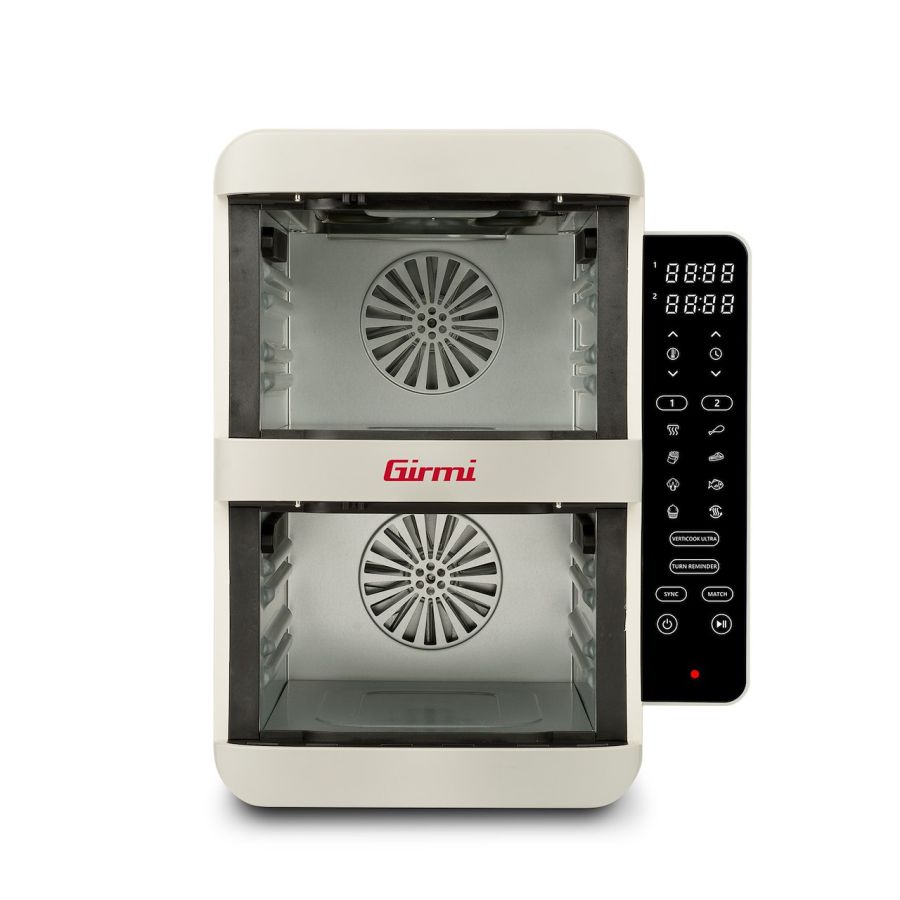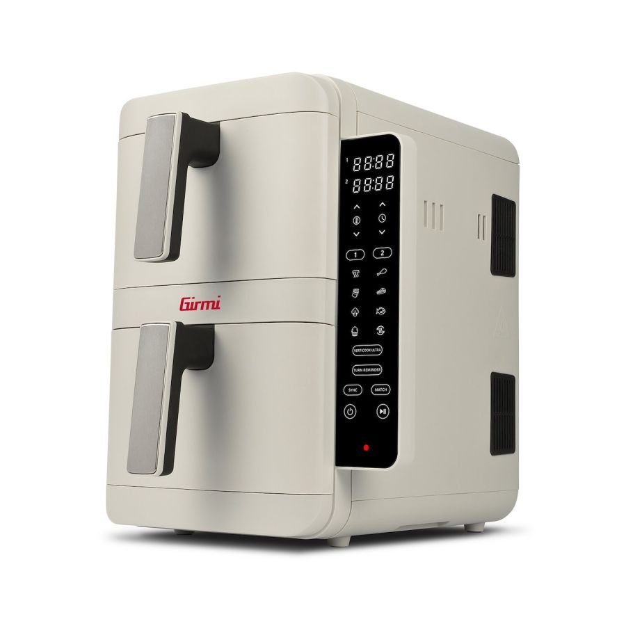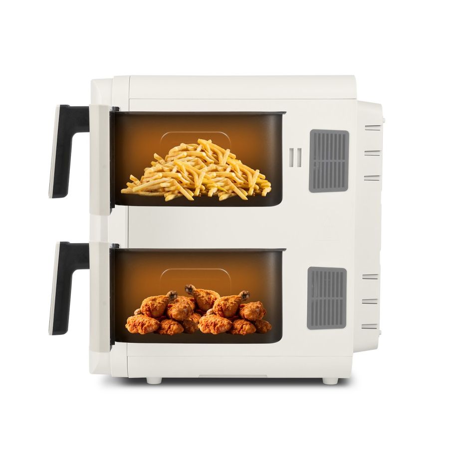 Altre caratteristiche ? Potenza: 2400W (1200+1200) ? 2 zone di cottura indipendenti ? Capacità totale 9 litri (4.5L + 4.5L, fino a 1800g) ? Contenitori e vassoi antiaderenti ? Timer e Temperatura regolabile (60-200°C) ? Display digitale. 9 programmi ? Funzione SYNC: termina entrambe le cotture nello stesso momento ? Funzione MATCH: raddoppia le porzioni, imposta la stessa cottura per entrambi gli scomparti ? Interno in metallo ? Dimensioni (mm): 310 x 375 x 450 ? Alimentazione: AC 220-240V ~ 50-60Hz