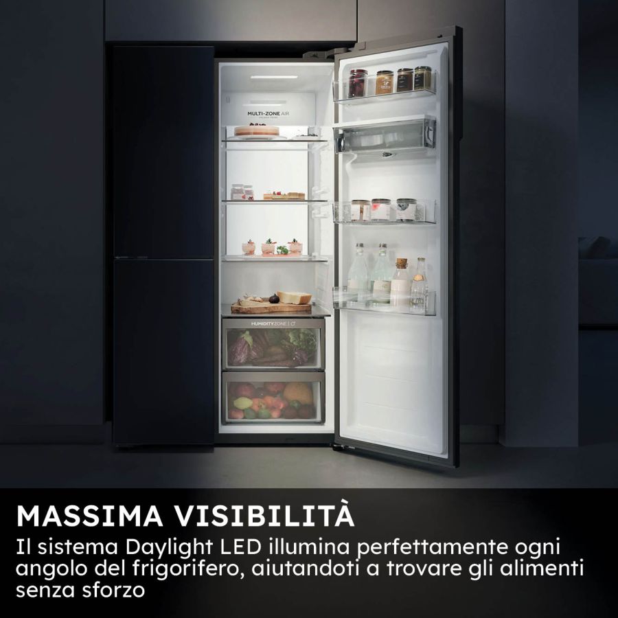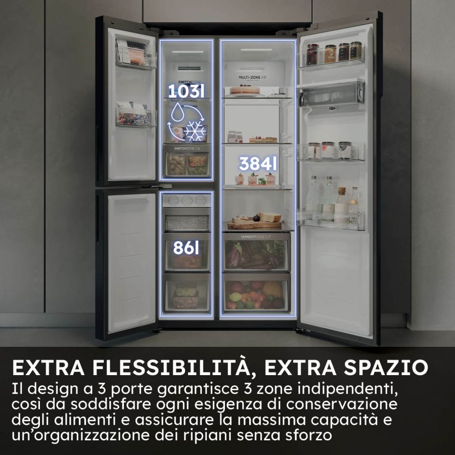 Doppi americani Haier HSPR79F18EWMB TRN948437Il frigorifero Haier SBS 3D è molto più di un semplice side-by-side. Offre un'ampia capacità di conservazione organizzata in tre diverse zone, con un accesso intuitivo ed efficiente dal punto di vista energetico a tutti gli spazi. Con le sue tre porte e l'esclusiva Switch Zone che può funzionare sia come frigorifero che come congelatore, il SBS 3D offre tutta la flessibilità di cui hai bisogno, senza compromessi in termini di capacità. Garantendo una perfetta conservazione degli alimenti grazie alla tecnologia avanzata, vanta anche un design elegante che dona un tocco di stile alla tua cucina.