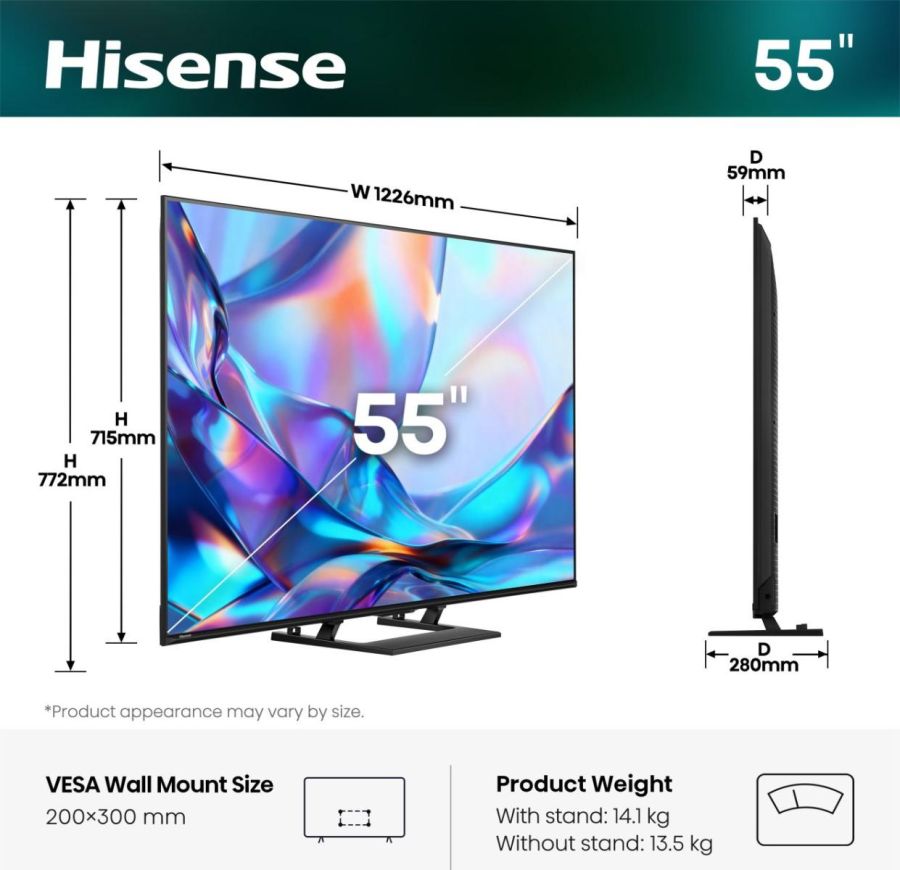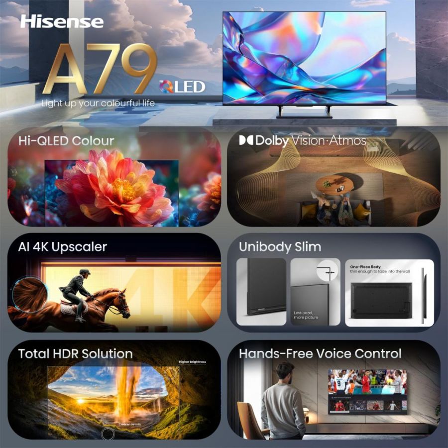 Da 50 a 100 pollici Hisense 55A79S 55A79S-6255A79S. Dimensioni diagonale schermo: 139,7 cm (55"), Risoluzione del display: 3840 x 2160 Pixel, Tipologia HD: 4K Ultra HD, Tecnologia display: QLED, Forma dello schermo: Piatto, Tipo di retroilluminazione LED: Direct-LED. Smart TV. Tempo di risposta: 8 ms, Rapporto d'aspetto nativo: 16:9. Formato del segnale digitale: DVB-C, DVB-S, DVB-S2, DVB-T2, DVB-T. Wi-Fi, Collegamento ethernet LAN. Colore del prodotto: Nero