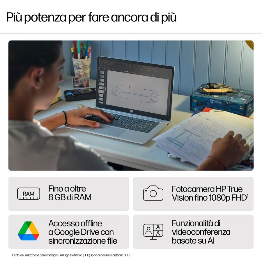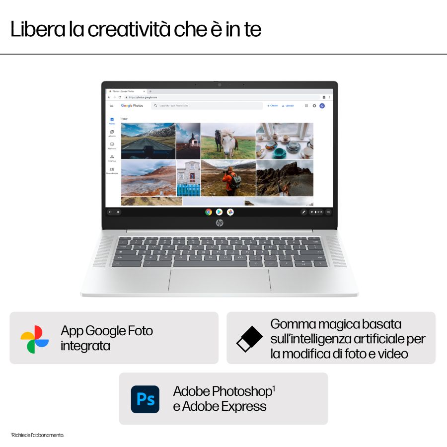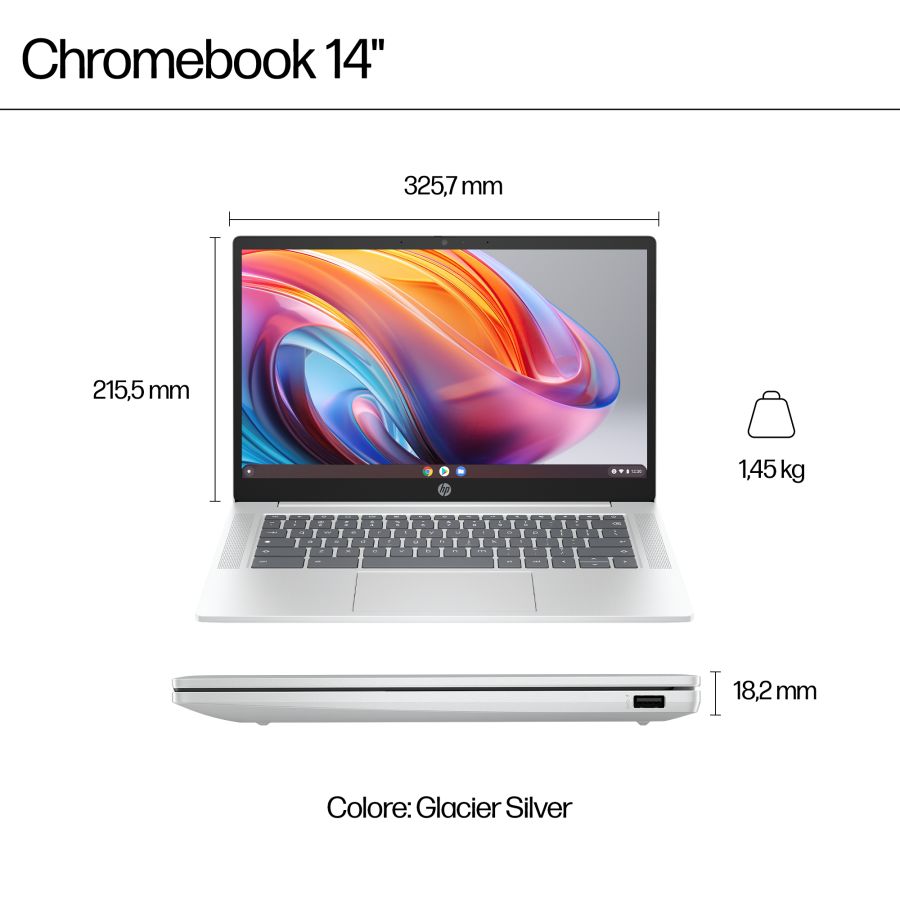 Aumenta produttività ed efficienza con HP Chromebook 14", che offre le prestazioni di un processore fino a Intel[1] e la facilità di utilizzo di Chrome OS. Vai oltre ogni limite con un ampio storage, velocità superiori e connettività wireless[2], avvio più rapido ed elevata autonomia con HP Fast Charge[3], per restare connessi per tutta la giornata.