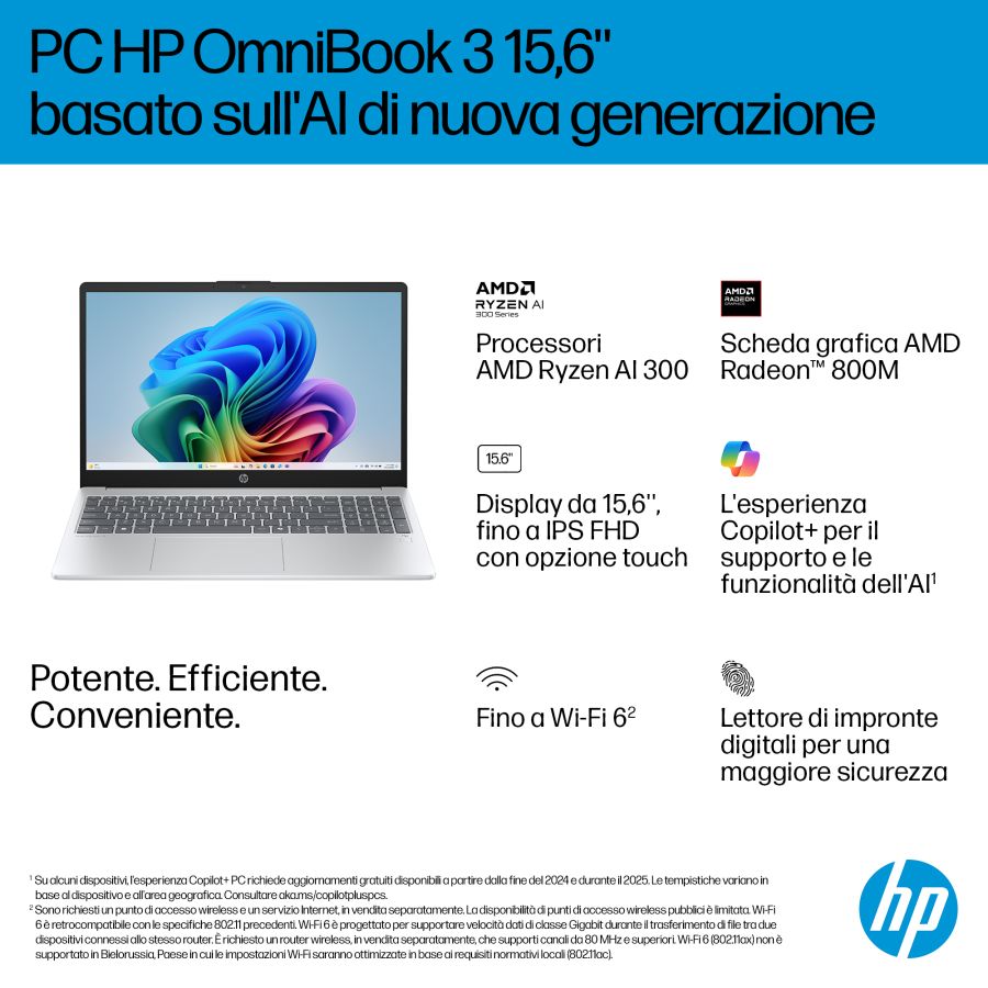 HP OmniBook 3 Laptop Next Gen AI 15-fn0006nl (C79MVEA) Affidabil ità, potenza e velocità HP OmniBook 3 15,6" è il PC basato sull' AI di nuova generazione che offre prestazioni ad alta velocità, c