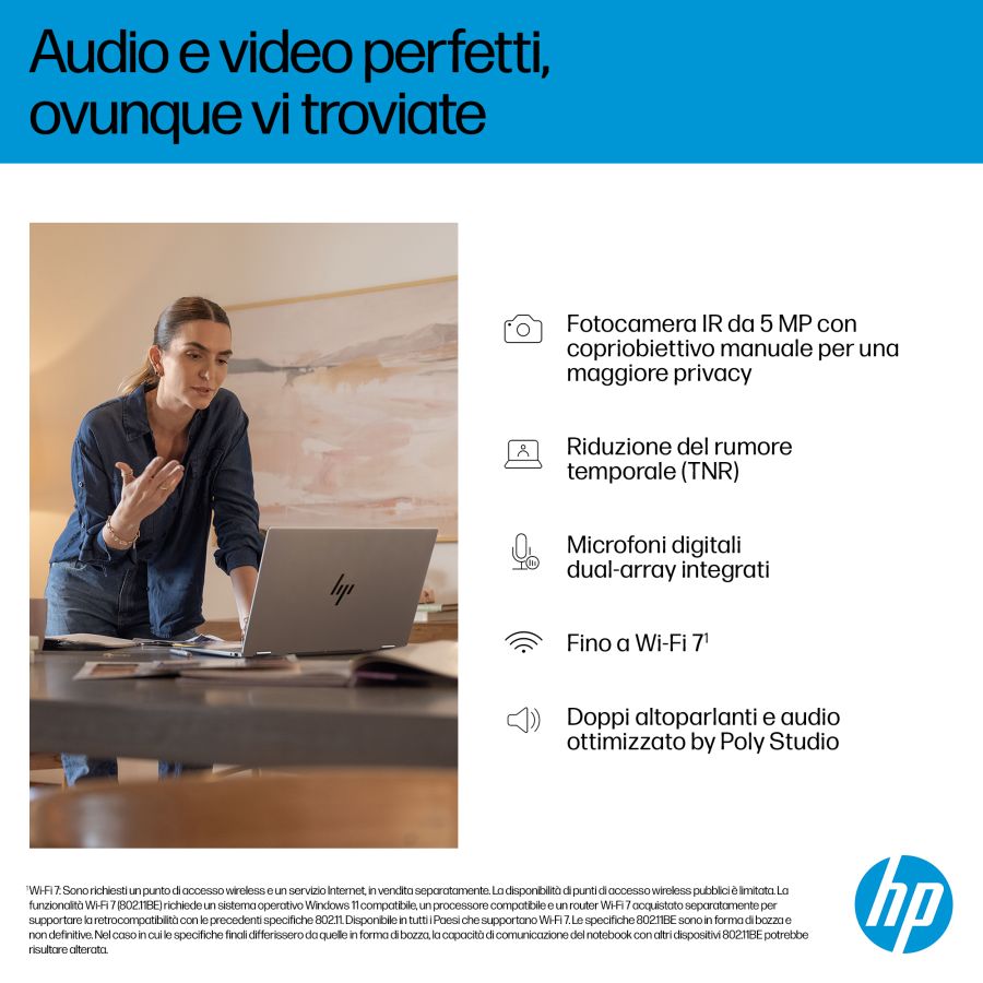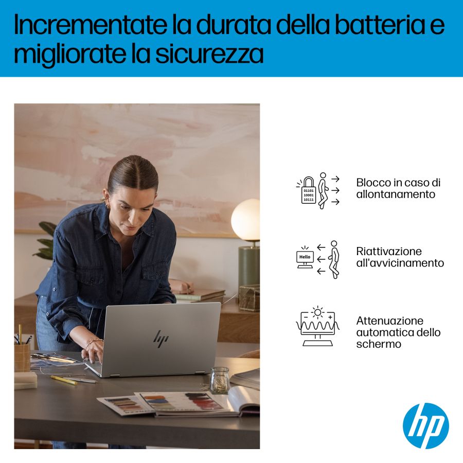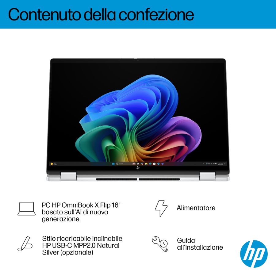 Il PC HP OmniBook X Flip 16 AI di nuova generazione combina velocità e prestazioni per attività creative e intrattenimento. L'ampio display da 16" si adatta alle tue esigenze di visualizzazione (piatto, piegato o capovolto) e offre colori brillanti da qualsiasi angolazione. Progettato con un elegante chassis in metallo riciclato[1] e una tastiera retroilluminata con ampi tasti per un'esperienza d'uso ottimale.