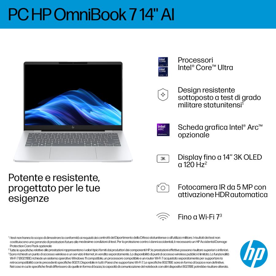 Notebook HP Hewlett Packard HP OmniBook 7 Laptop AI 14-fr0028nl OMNI7 U7 32/1T D3ZJ5EA#ABZ D3ZJ5EAUn PC basato sull?AI, realizzato per durare nel tempo e per eccellere