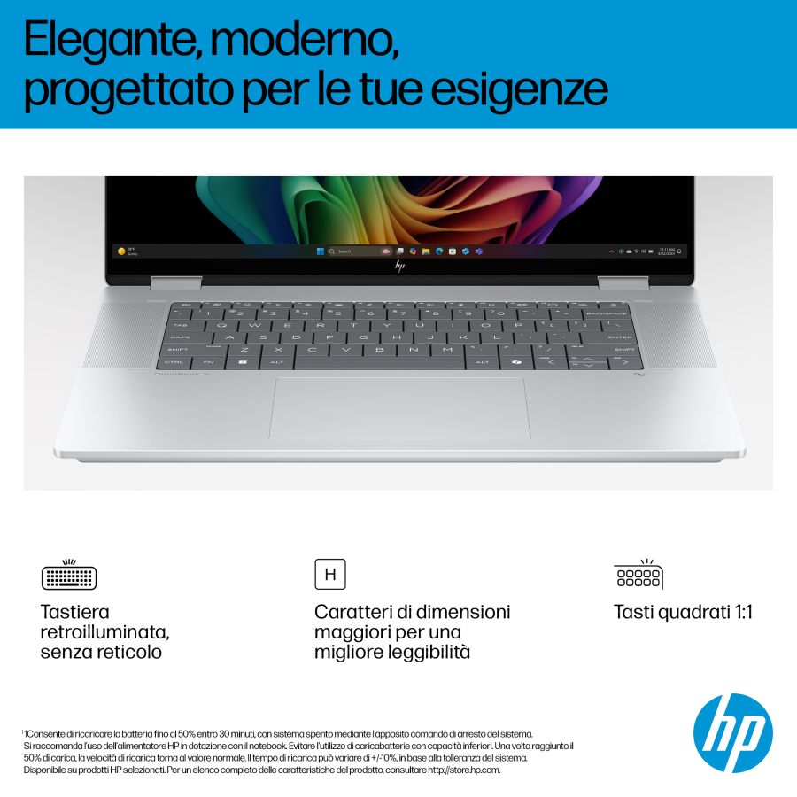Il PC HP OmniBook X Flip 16 AI di nuova generazione combina velocità e prestazioni per attività creative e intrattenimento. L'ampio display da 16" si adatta alle tue esigenze di visualizzazione (piatto, piegato o capovolto) e offre colori brillanti da qualsiasi angolazione. Progettato con un elegante chassis in metallo riciclato[1] e una tastiera retroilluminata con ampi tasti per un'esperienza d'uso ottimale.