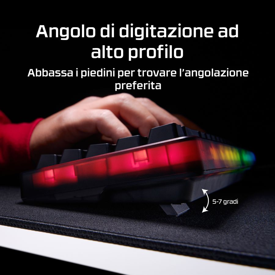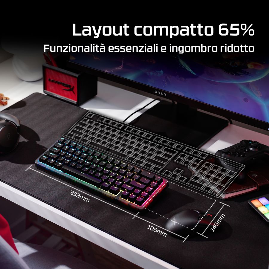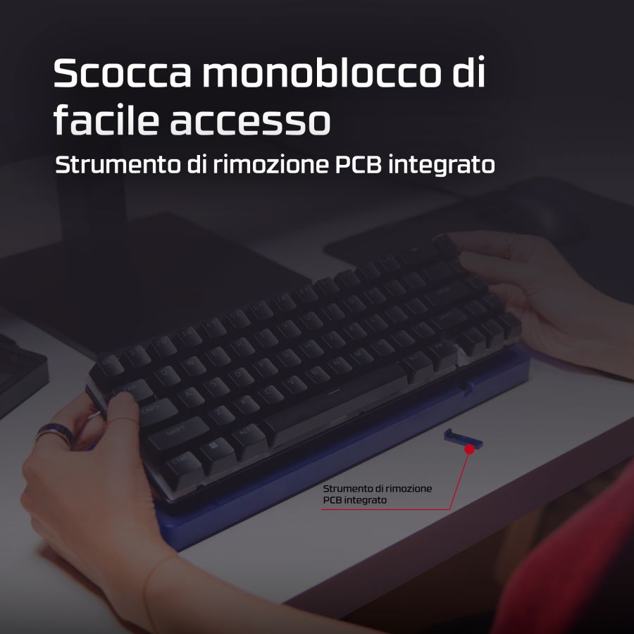 Gioca al meglio con Origins 2 65, una tastiera da gaming compatta progettata per la personalizzazione. Dotata di scocca e switch sostituibili, Origins 2 può essere personalizzata per creare la tua postazione di gaming unica. Cambia copritasti, switch e scocca in qualsiasi momento![1] Origins 2 65 elimina i tasti superflui mantenendo tutte le funzioni essenziali, riducendo l?ingombro e aumentando l'efficienza. Il layout 65% occupa meno spazio sulla scrivania e ti consente di immergerti completamente nel gioco. Sotto il cofano, troverai un supporto O-ring in silicone e una piastra in policarbonato per assorbire le vibrazioni e ridurre il riverbero per un'esperienza di digitazione silenziosissima. Ma questa tastiera non è solo ideale per scrivere. Con un polling fino a 8K, Origins 2 invia gli input al tuo PC fino a 8000 volte al secondo, assicurandoti l?esecuzione di ogni comando. La scocca ad alto profilo è dotato di piedini ribaltabili che consentono di regolare l?inclinazione per il massimo comfort e un'ergonomia ideale. Questa tastiera è dotata di switch HyperX Linear Red che forniscono un feedback rapido e fluido e una rapida corsa di attuazione di soli 1,8 mm. Gli switch HyperX utilizzano steli POM a mezza parete per offrire stabilità e affidabilità fino a 80 milioni di battute, e puoi sostituirli ogni volta che vuoi. Le basi hot-swap dei tasti sono compatibili con la maggior parte degli switch per tastiere meccaniche a 5 o 3 pin. Origins 2 è completamente personalizzabile con il software HyperX NGENUITY. Puoi facilmente rimappare le funzioni dei tasti, assegnare macro, personalizzare gli effetti RGB e creare fino a 3 profili per la massima funzionalità in qualsiasi situazione.