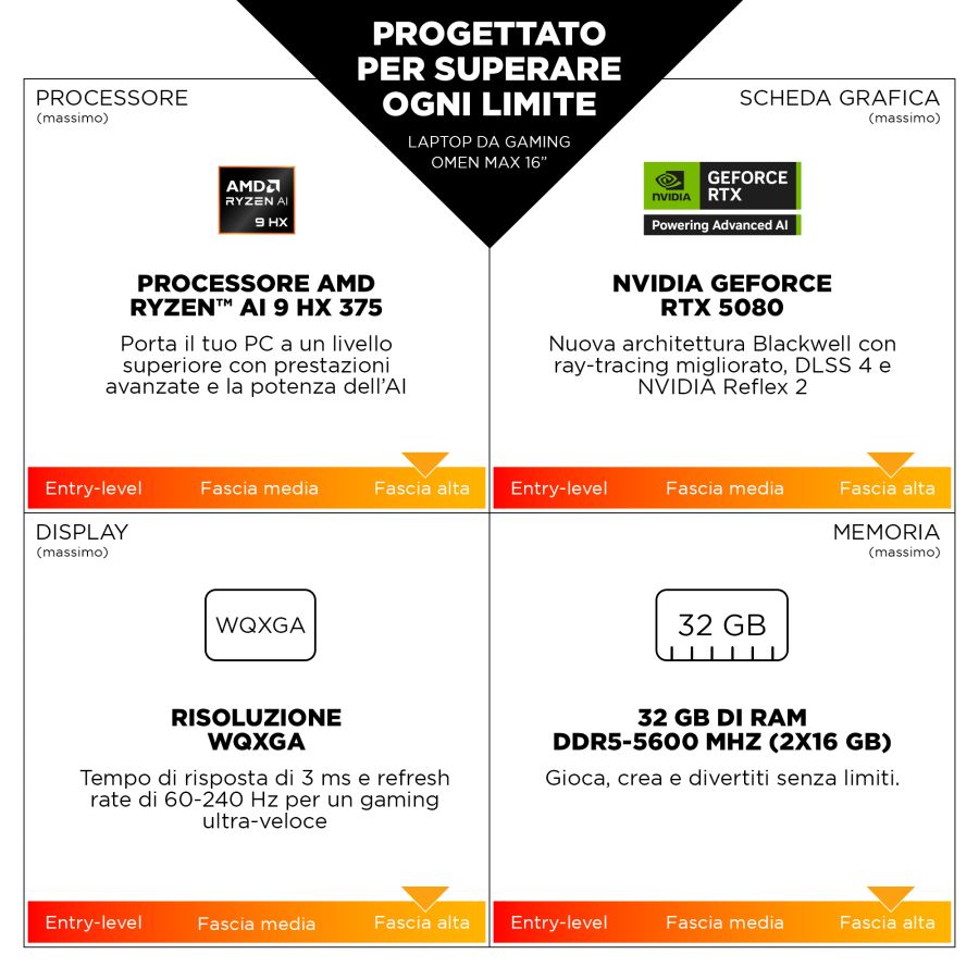 Il laptop da gaming OMEN 16 MAX offre prestazioni impareggiabili, a casa o in movimento. Con le GPU NVIDIA di nuova generazione e le CPU AMD Ryzen?[1], una nuova modalità Unleashed per l'overclocking manuale e un'architettura termica creata per ridurre sia il throttling che l'usura a lungo termine, i gamer appassionati potranno dare il meglio di sé per molti anni a venire.