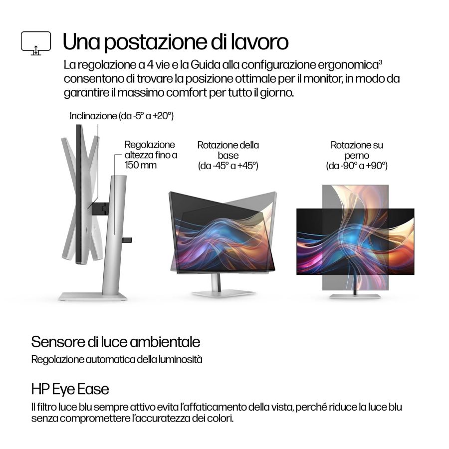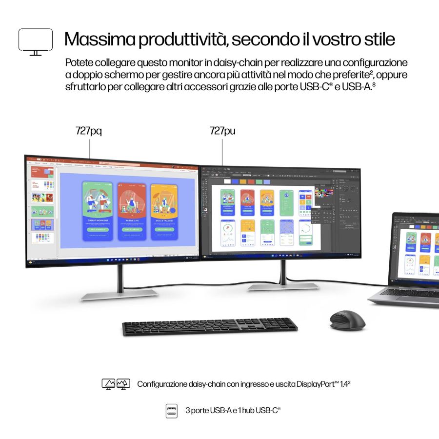 HP HP 727pq QHD MNTR - QHD (2560 x 1440), 16:9, 400 nit, 2000:1, Senza bordi su 4 lati, 100% sRGB, 98% Display P3, IPS Black, Refresh Rate 120 Hz, 1 HDMI, 1 DisplayPort in, 1 DisplayPort out, 3 USB-A, 2 USB Type-C data transfer only