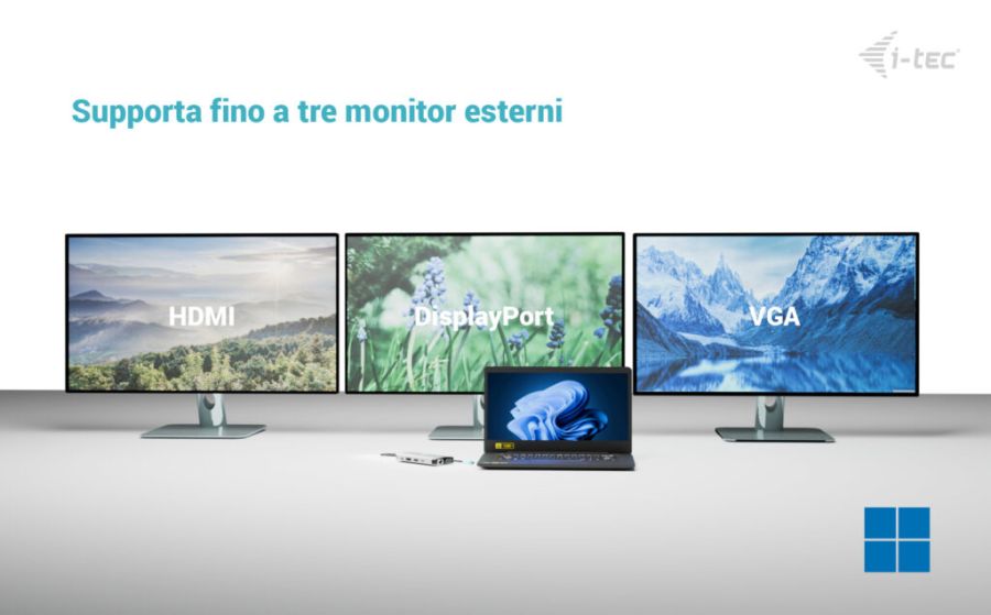 La docking station offre una combinazione di HDMI, DisplayPort e VGA, rendendo semplice il collegamento sia di display moderni che legacy. Supporta fino a 4K/60 Hz con un singolo monitor oppure più schermi contemporaneamente (fino a 3× 1080p). Una soluzione ideale per uffici, postazioni di lavoro domestiche e ambienti di lavoro flessibili.