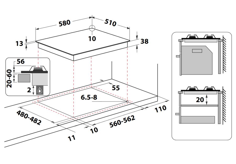 INDESIT P/COTTURA THP642 IX I 1 INOXGas,Comandi Frontali,LxPxA 58x51x5.6cm