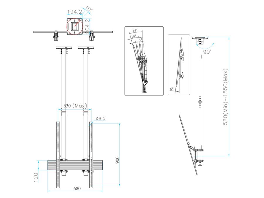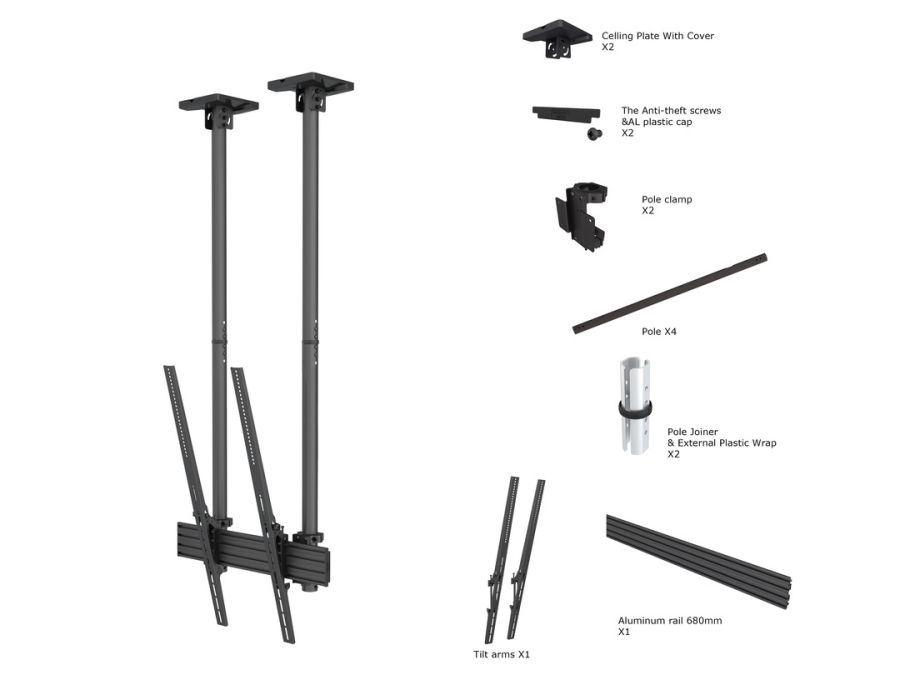 STAFFE/SUPPORTI ITB KIT A SOFFITTO DOPPIA COLONNA 40-100 180 KG MB6133Multibrackets 6133. Peso massimo (capacità): 180 kg, Capienza minima dimensioni dello schermo: 101,6 cm (40"), Capienza massima dimensioni dello schermo: 2,54 m (100"), Compatibilità interfaccia di montaggio (min): 100 x 100 mm, Compatibilità interfaccia di montaggio (max): 600 x 900 mm. Range di regolazione altezza: 580 - 1550 mm, Inclinazione: -6 - 15°, Angolo di rotazione: 90°. Colore del prodotto: Nero