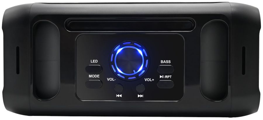 Di forma orizzontale, è facilmente trasportabile grazie all cinghia a tracolla. Dotato di due woofer 2x3". Il suono potente lo rende idoneo a feste con amici. La batteria ricaricabile permette di utilizzarlo per ore in completa libertà. La ricarica può essere effettuata tramite cavo USB-TypeC Potrete alimentarlo anche con un normale power bank. Sulla parte superiore è presente il pannello di comando con i regolatori di volume i tasti di equalizzazione, controllo led e scelta delle tracce. Posteriormente sono posizionati i connettori di ricarica, le prese microSD e USB, una presa Aux 3,5mm e il tasto di accensione. In dotazione, viene fornito un pratico microfono per dilettarsi nel Karaoke o per semplici annunci.