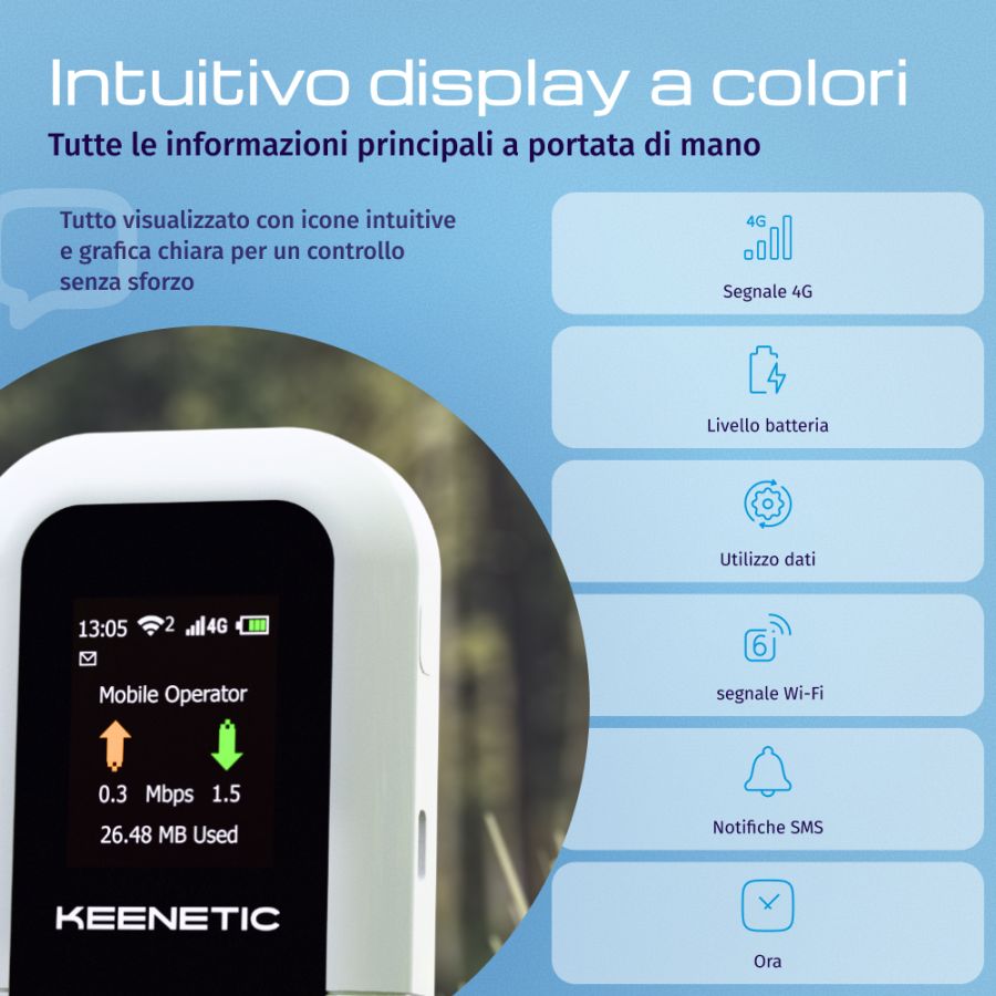 Progettato per chi è sempre in movimento, Keenetic Roamer 4G è molto più di un semplice hotspot: è il tuo alleato digitale tascabile. Grazie allo schermo a colori hai subito sotto controllo segnale, dati e batteria (che ti accompagna per tutto il giorno, senza interruzioni, grazie alla sua lunga durata). Dimentica le reti Wi?Fi pubbliche e insicure: Roamer 4G crea una rete privata e crittografata ovunque tu sia. Leggero, compatto e intuitivo, è la scelta più smart per connetterti meglio, ovunque.
