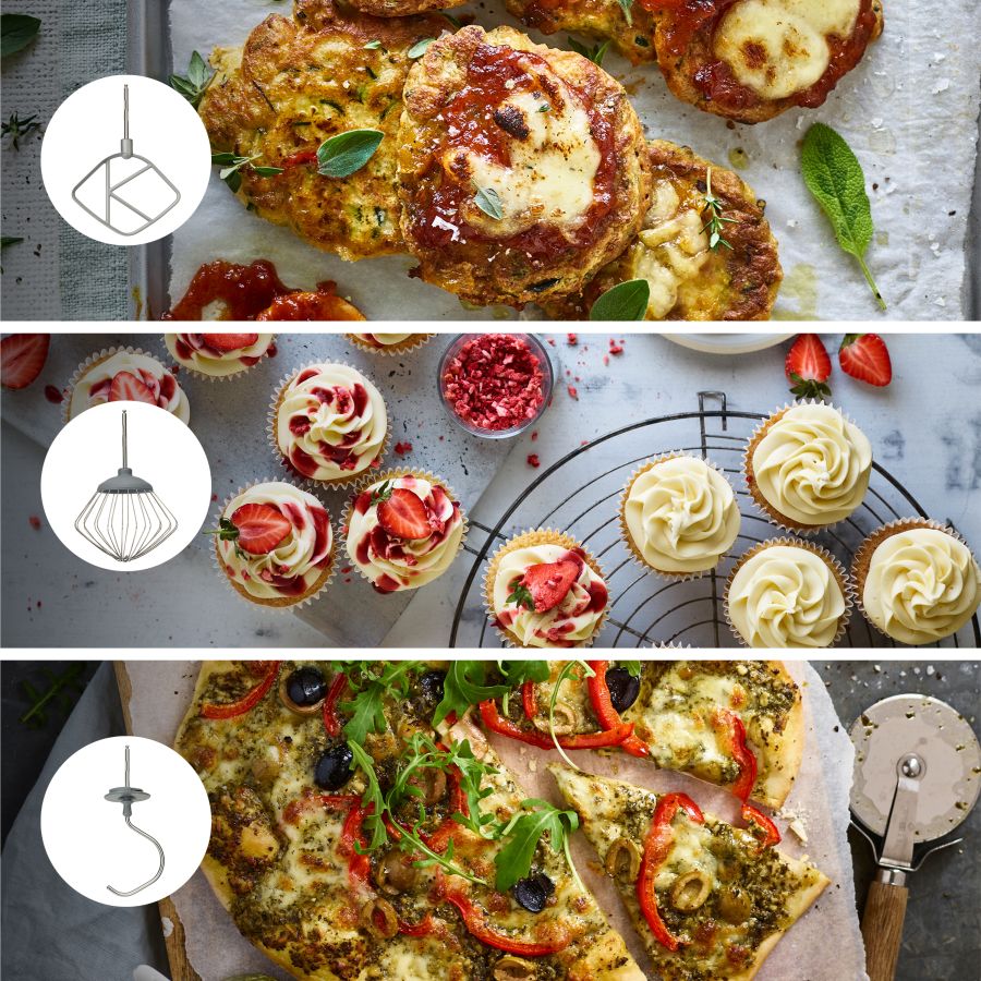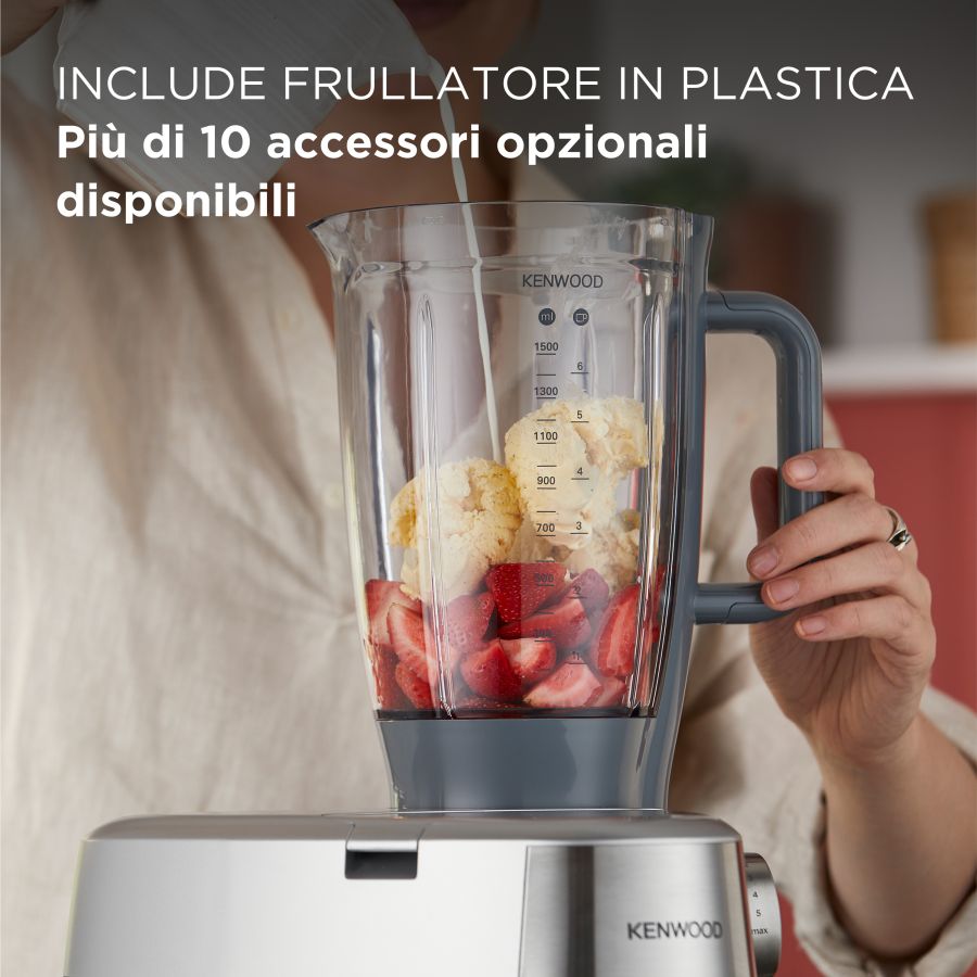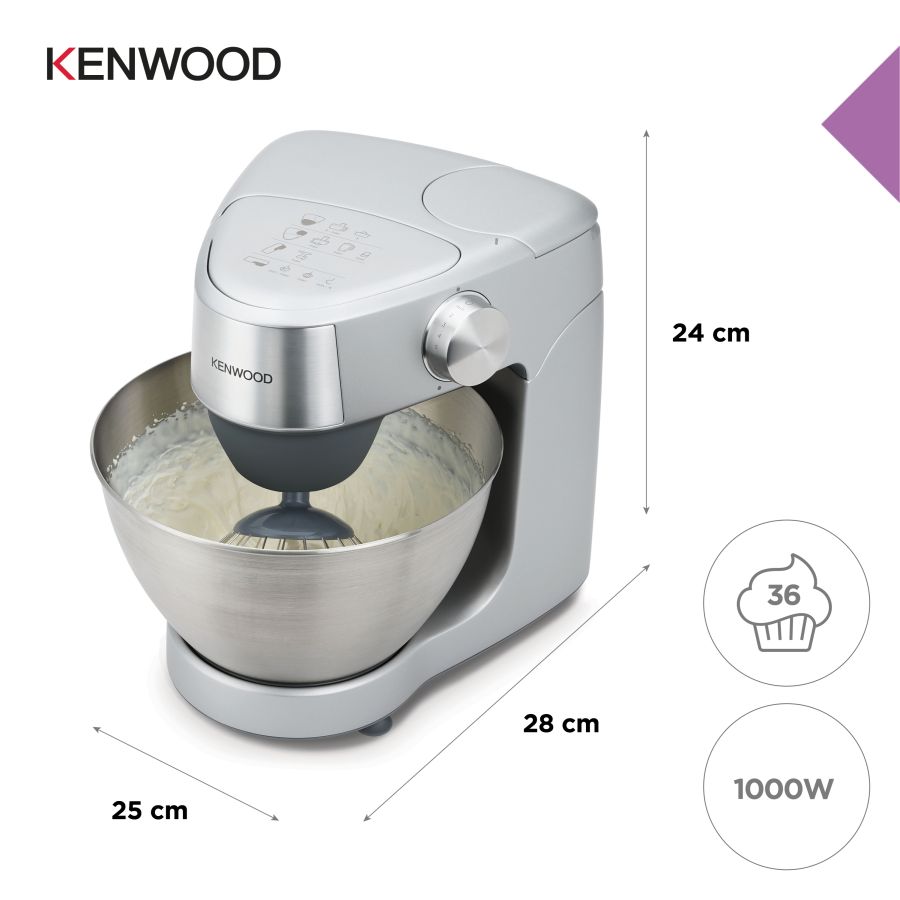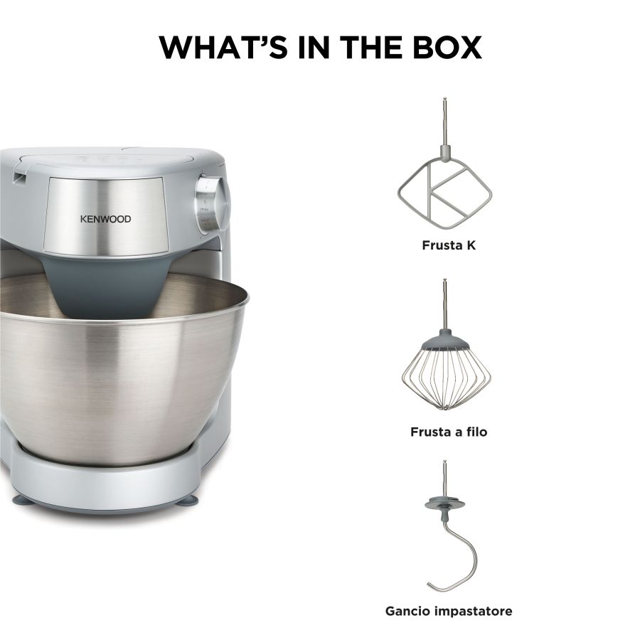 Robot da Cucina Kenwood PLANET. KHC29AOSI DIFPRKENKHC29AOSIFinitura in silver,corpo in plastica, 1000W, 3 utensili di miscelazione (frusta K, frusta a filo, gancio impastatore), movimento planetario, ciotola in acciaio da 4,3 l, sistema Interlock.
