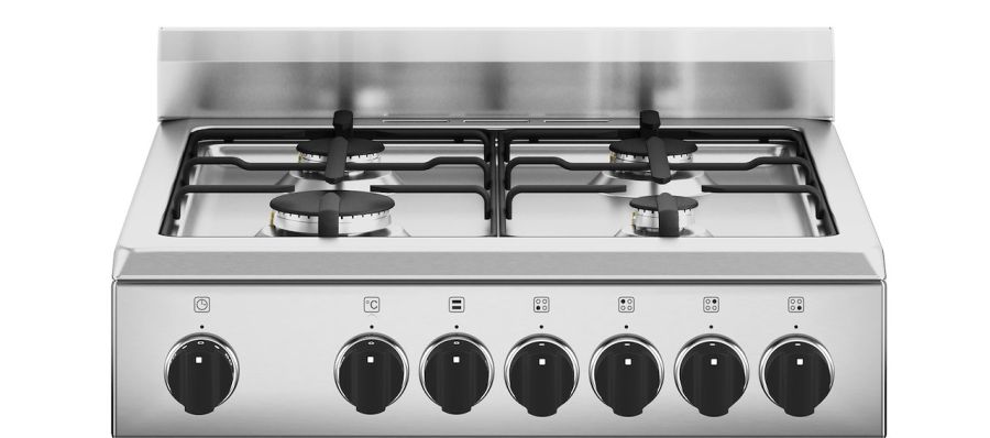 Cucina 60x60 cm, 4 fuochi, forno elettrico multifunzione con grill, 5 funzioni, estetica inox, manopole soft touch, volume forno 56 lt., contaminuti, classe energetica A.