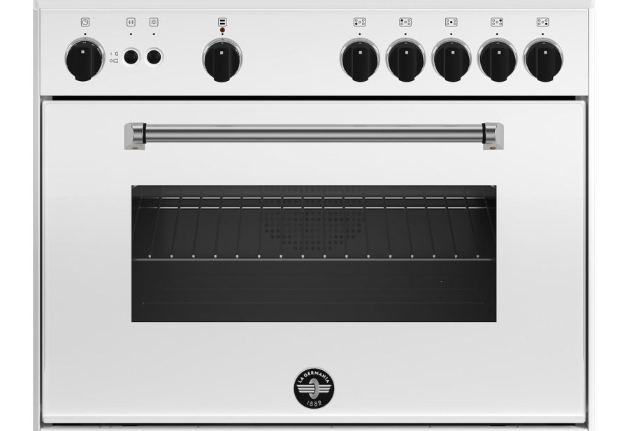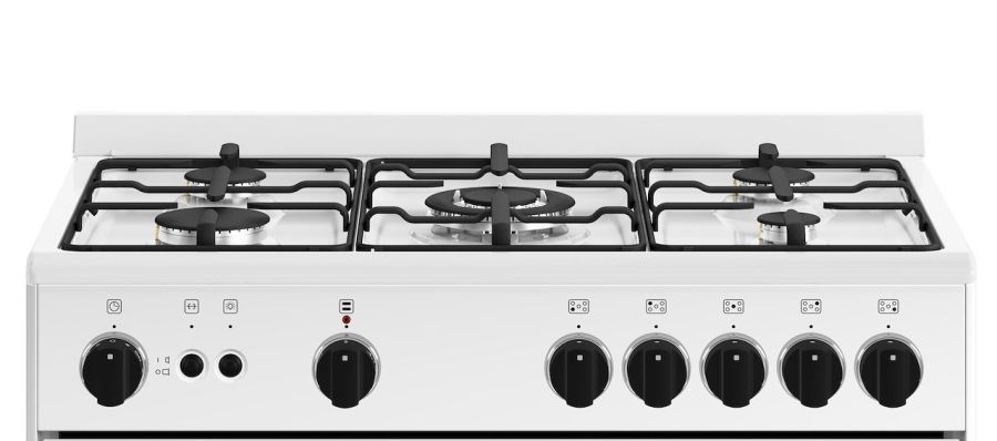 Cucina 80x50 cm, 5 fuochi, forno a gas ventilato con grill, estetica colore bianco, tripla corona centrale, manopole soft touch, forno 5 funzioni, volume 75 lt., classe energetica A.