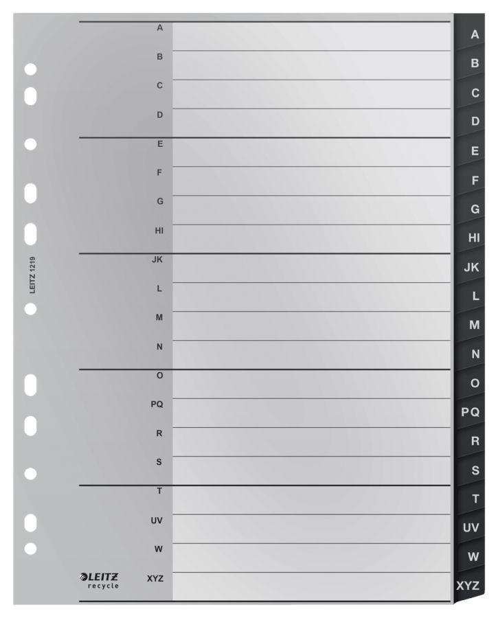 Intercalari Leitz Recycle CF20 INDICEA-Z - F.TO A4 12190000 1219000012190000. Colore del prodotto: Nero, Materiali: Polipropilene (PP), Formato: A4. Larghezza: 238 mm, Profondità: 297 mm, Altezza: 3 mm. Peso dell'imballo: 160 g. Quantità per pacco: 1 pz. Paese di origine: Germania