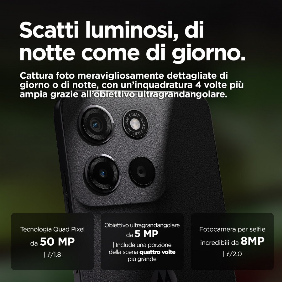 Moto g15 ti offre il meglio dell'intrattenimento cinematografico. Guarda i tuoi spettacoli e film preferiti su uno schermo Full HD+ da 6,72? sorprendentemente nitido e luminoso, anche all'aperto sotto la luce del sole. Ascolta un audio avvolgente grazie ai potenti altoparlanti stereo con Amplificazione bassi e Dolby Atmos®. Scatta foto straordinariamente dettagliate con il comparto fotografico da 50 MP(1) che elimina gli effetti fastidiosi causati dalle sorgenti di luce artificiali. Ricarica velocemente con la ricarica TurboPower?(2) e approfitta di un'autonomia maggiore con la batteria da 5200 mAh. Goditi il look raffinato del materiale premium vegano e la protezione offerta dal design idrorepellente(3) e da Corning® Gorilla® Glass 3. Inoltre, grazie alle prestazioni ultra rapide e all'ampia memoria di archiviazione, avrai sempre spazio per il divertimento. Illumina ogni giornata con Moto g15.