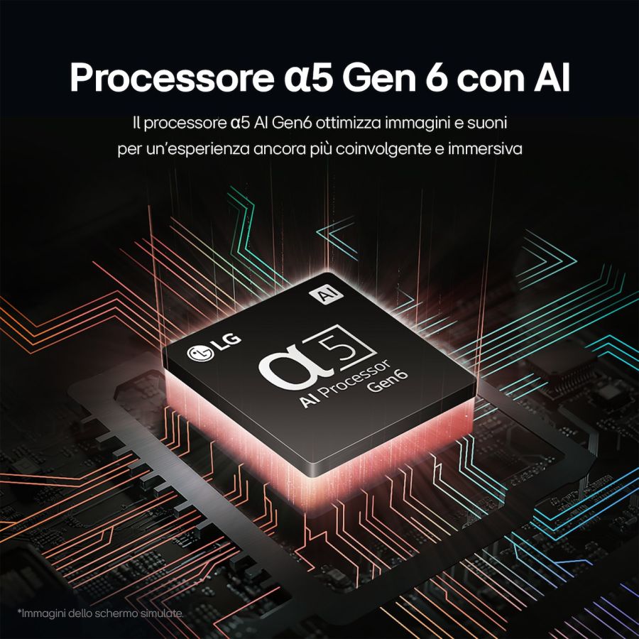Il nuovo processore ?5 Gen 6 migliora i contenuti che guardi sul TV attraverso un'accurata elaborazione delle immagini e del suono. Il processore controlla la luminosità dello schermo applicando dei sofisticati algoritmi basati sull'Intelligenza Artificiale. Per il suono, la funzione AI Sound riconosce cosa stai riproducendo e adatta di conseguenza la resa audio.