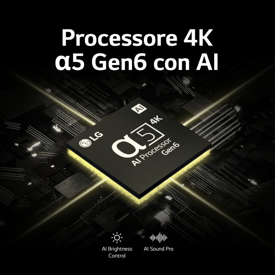 Il nuovo processore ?5 Gen6 migliora i contenuti che guardi sul TV attraverso un'accurata elaborazione delle immagini e del suono. Per le immagini, il processore trasforma in 4K anche i contenuti a una risoluzione inferiore e controlla la luminosità dello schermo applicando dei sofisticati algoritmi basati sull'Intelligenza Artificiale. Per il suono, la funzione AI Sound riconosce cosa stai riproducendo e adatta di conseguenza la resa audio.