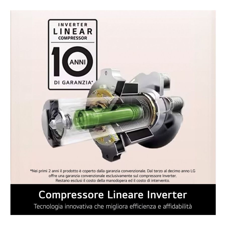 Abbiamo progettato il compressore Lineare Inverter per garantirti la massima silenziosità e affidabilità nel tempo, tanto che lo garantiamo 10 anni. Rispetto ai canonici compressori - che sfruttano meccanismi con albero motore e biella - quello Lineare ha meno punti di frizione, perché il pistone si muove solo orizzontalmente.