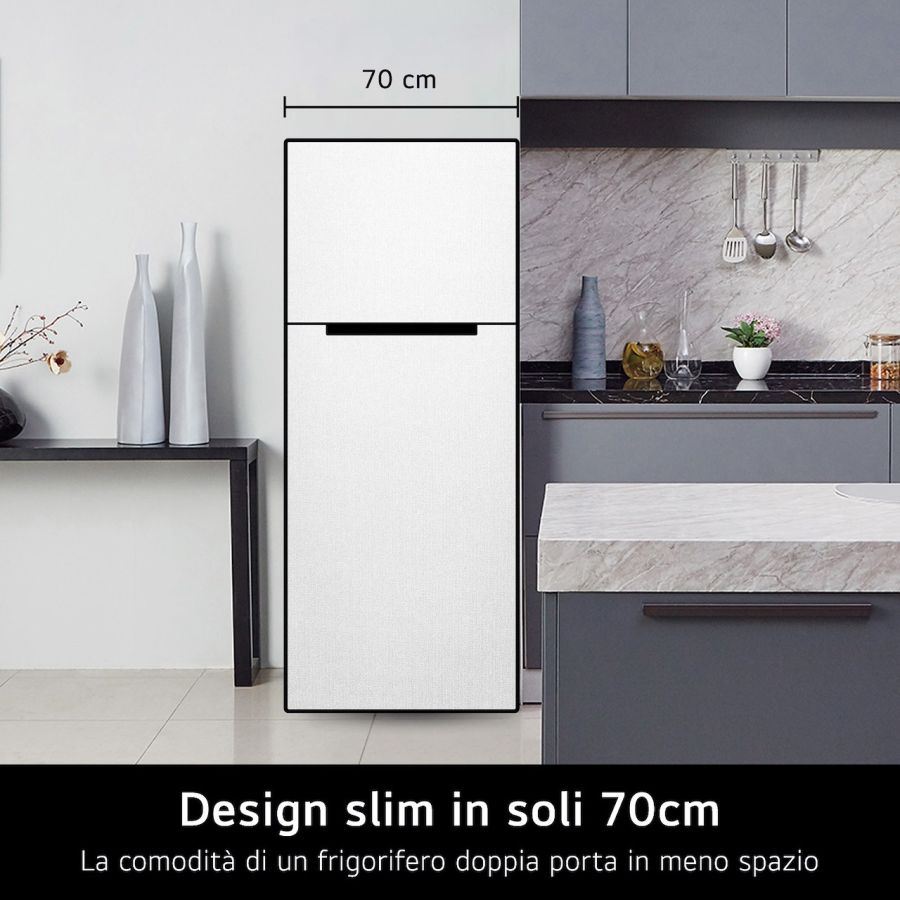 Grazie alla larghezza di soli 70cm, questo modello è più stretto rispetto ai frigoriferi doppia porta tradizionali. In questo modo puoi installarlo anche se hai poco spazio, mantenendo la comodità di avere il freezer nella parte superiore del frigo.