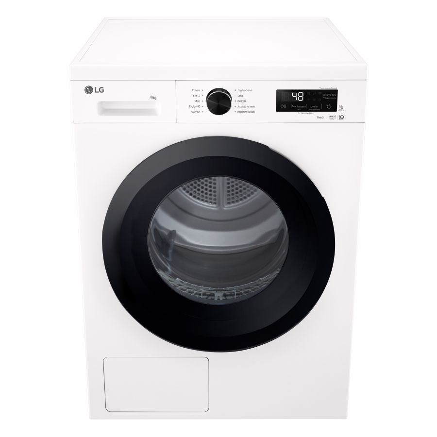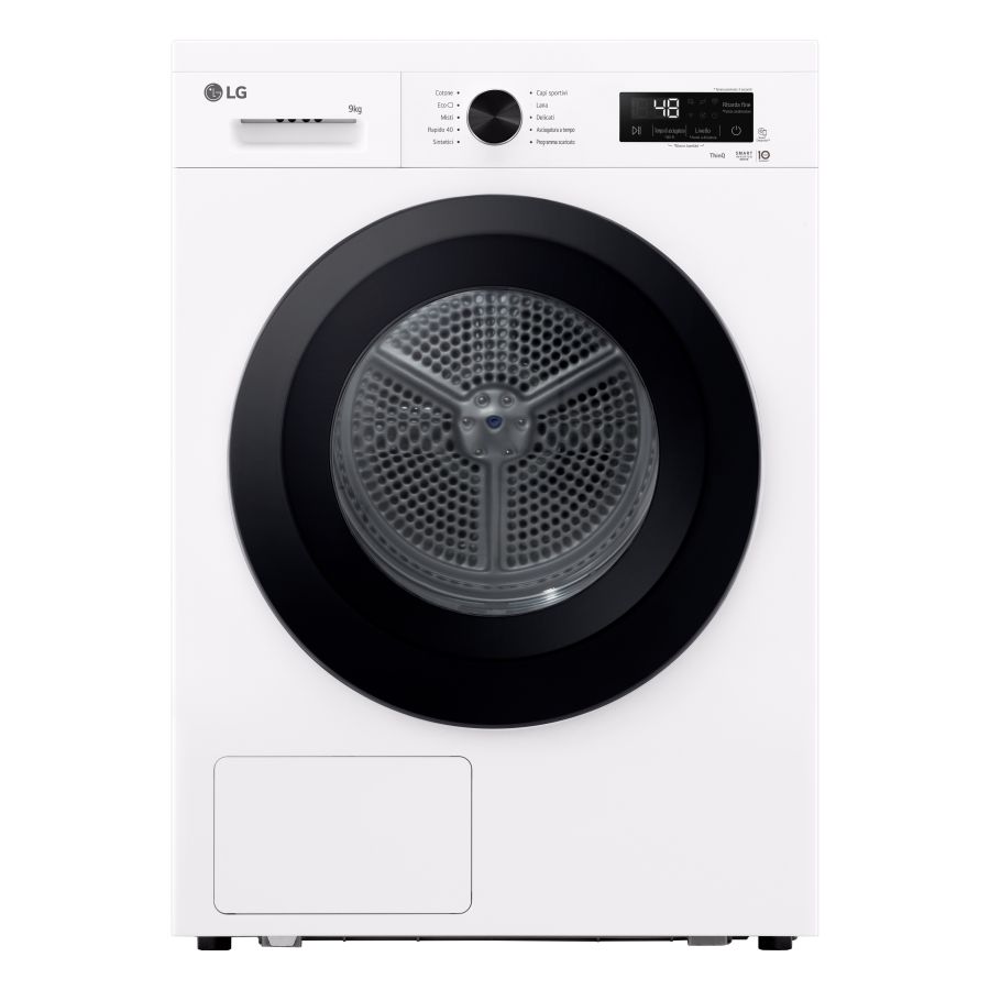 Asciugatrici LG RNX1009NWK Asciugatrice 9kg Pompa di calore Classe C TCRNX1009NWKRNX1009NWK. Posizionamento dell'apparecchio: Libera installazione, Tipo di carica: Caricamento frontale, Sistema di asciugatura: Pompa di calore. Capacità cestello: 9 kg, Classe di efficienza della condensazione: B, Programmi di asciugatura: Cotone, Eco, Mix, Rapido, Delicati/Seta, Lana, Sintetico, Programmato, Abbigliamento sportivo,.... Partenza ritardata: 19 h, Avvio ritardato (min): 3 h, Applicazioni per il controllo supportate: ThinQ. Classe efficienza energetica: C, Consumo energetico per 100 cicli: 106 kWh, Consumo energetico: 1,06 kWh. Profondità: 660 mm, Larghezza: 600 mm, Altezza: 850 mm