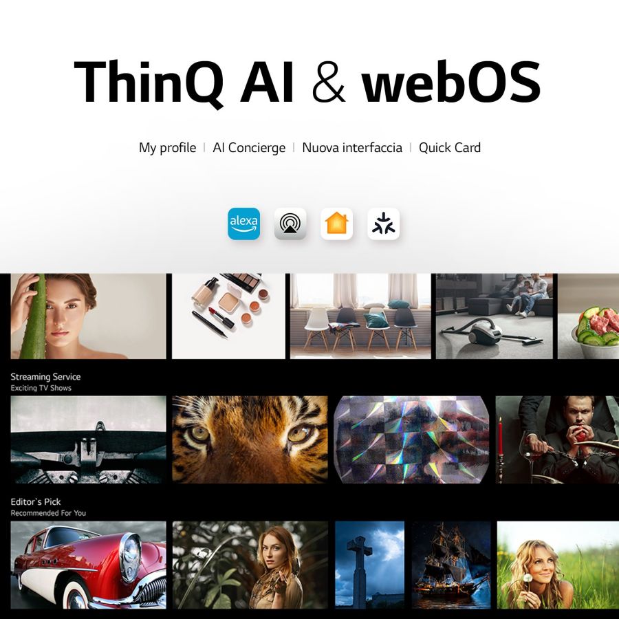 Questo TV è davvero intelligente, perché integra l'assistente ThinQ AI che ti consiglia cosa vedere in base alle tue abitudini. Grazie alla piattaforma smart TV webOS 23 trovi tutti ancora più rapidamente, grazie alle schede tematiche accessibili direttamente dalla schermata principale. Inoltre, trovi tantissimi servizi di streaming per non perderti le serie TV e i film più chiacchierati del momento.