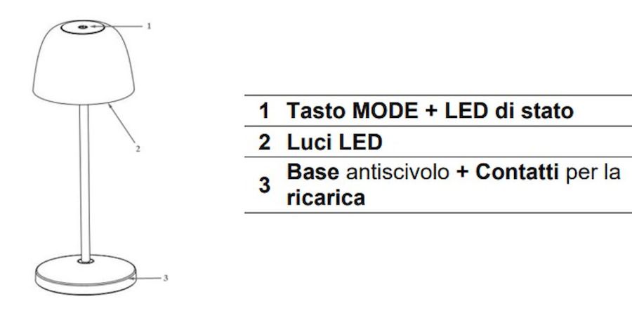 Altre caratteristiche Utilizzabile come lampada da tavolo. Adatta ad interni ed esterni (protezione IP54) Batteria ricaricabile al litio integrata 3, 7V 7800mAh Autonomia minima 9 ore / massima 45 ore a seconda della luminosità Cavo USB-C per la ricarica della batteria incluso (caricabatterie non incluso)