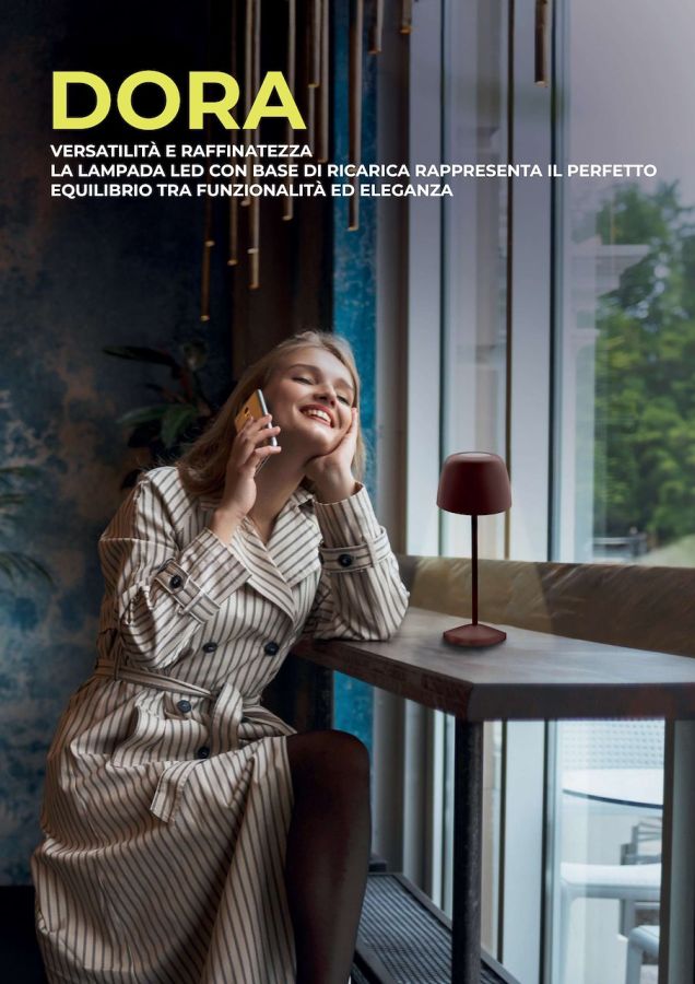 Elegante, versatile e senza fili: la nuova lampada LED DORA illumina i tuoi spazi con stile. Grazie alla base di ricarica wireless a contatto e alla batteria a lunga durata, è perfetta per ogni ambiente, sia interno che esterno (IP54). Scegli tra tre tonalità di luce ? calda, naturale e fredda ? e regola l?intensità con un semplice tocco grazie al comando touch. Disponibile in tre raffinati colori (Corten, Grigio e Sabbia), unisce funzionalità e design moderno. DORA è la lampada ideale per chi cerca atmosfera, praticità e libertà di movimento, ovunque e in ogni momento