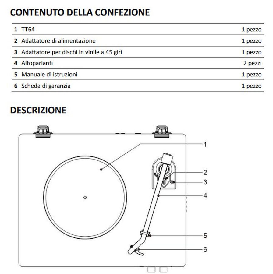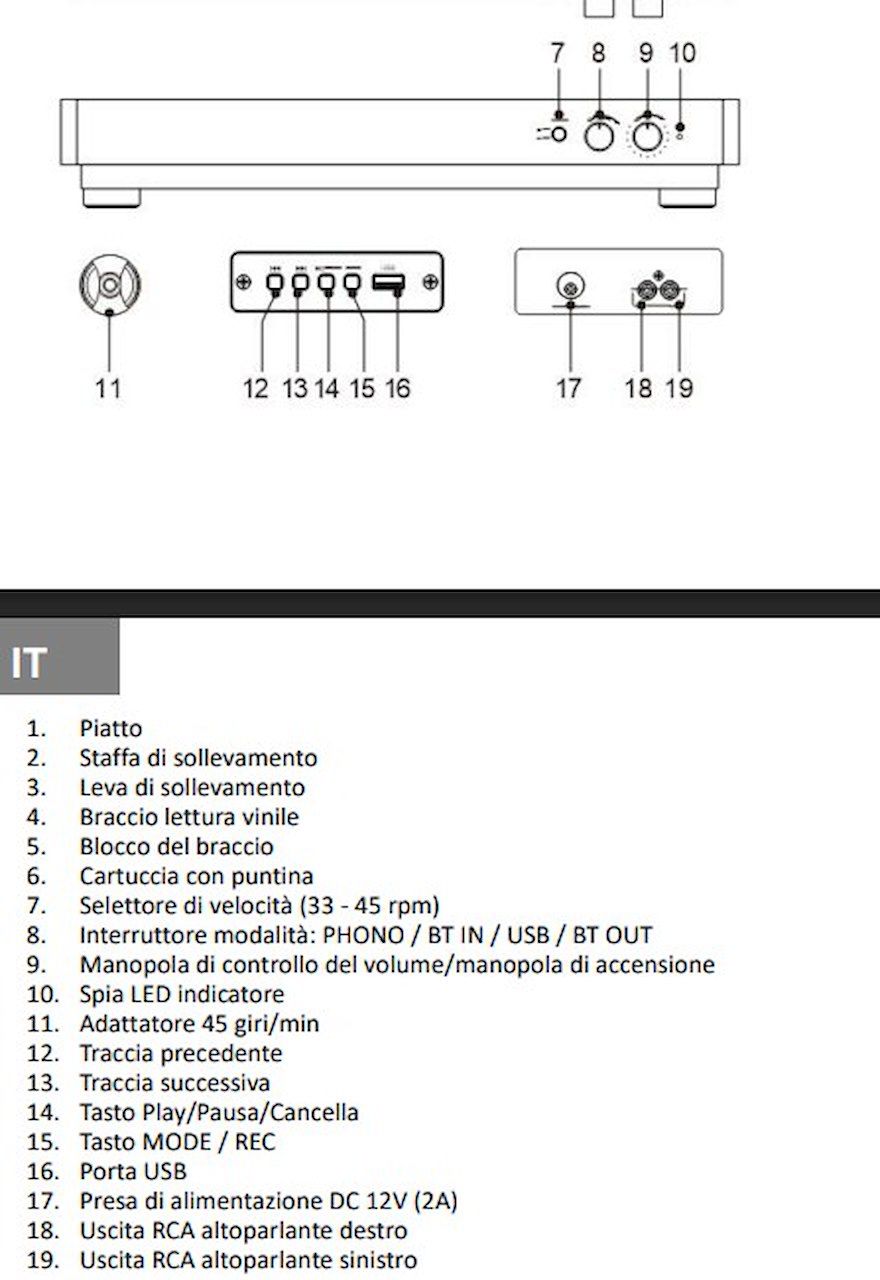 Accessori in dotazione Alimentatore AC 100-240V, 50/60Hz DC-12V 2A Adattatore per dischi 45 giri incluso