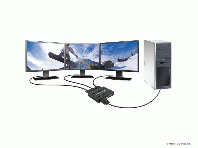 Matrox TripleHead2Go è un'espansione esterna per schermo multiplo adatta a notebook e computer desktop. Ideale per i professionisti che richiedono ampio spazio desktop per la massima produttività e per chi utilizza giochi e desidera un'esperienza totalmente coinvolgente, questa scatola di piccole dimensioni consente di eseguire applicazioni diverse su ciascuno schermo o di visualizzare un'applicazione su un massimo di tre monitor. È disponibile nelle versioni DisplayPort, Digital (digitali) o Analog (analogici).