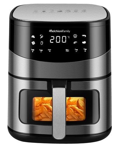 Friggitrici Melchioni 118340047 FRIGGITRICE AD ARIA ARIANNA 6,5LT 2000W DISPLAY TOUCH OBLO\' ECO160626La friggitrice ad aria ARIANNA da 6,5 litri si distingue per la sua doppia resistenza che garantisce una cottura uniforme e rapida, ideale per preparare piatti croccanti con una significativa riduzione dei grassi. Il cestello con finestra permette di monitorare visivamente la cottura senza interrompere il processo, mentre il display LED, offre un'interfaccia semplice e intuitiva per impostare timer e temperatura. La temperatura è regolabile da 80°C a 200°C, coprendo un ampio range per adattarsi a diverse ricette, con la possibilità di programmare fino a 8 diverse modalità preimpostate. Il timer integrato consente di impostare la durata della cottura fino a 30 minuti, offrendo un controllo preciso e facilitando l?utilizzo anche per chi non è esperto. Con un consumo energetico di 2000 watt e un livello di rumorosità contenuto a 39,9 decibel, questa friggitrice è progettata per un uso domestico efficiente e silenzioso. Il design elegante in colore grigio nero con rivestimento in acciaio inox la rende un complemento funzionale e raffinato per ogni cucina.