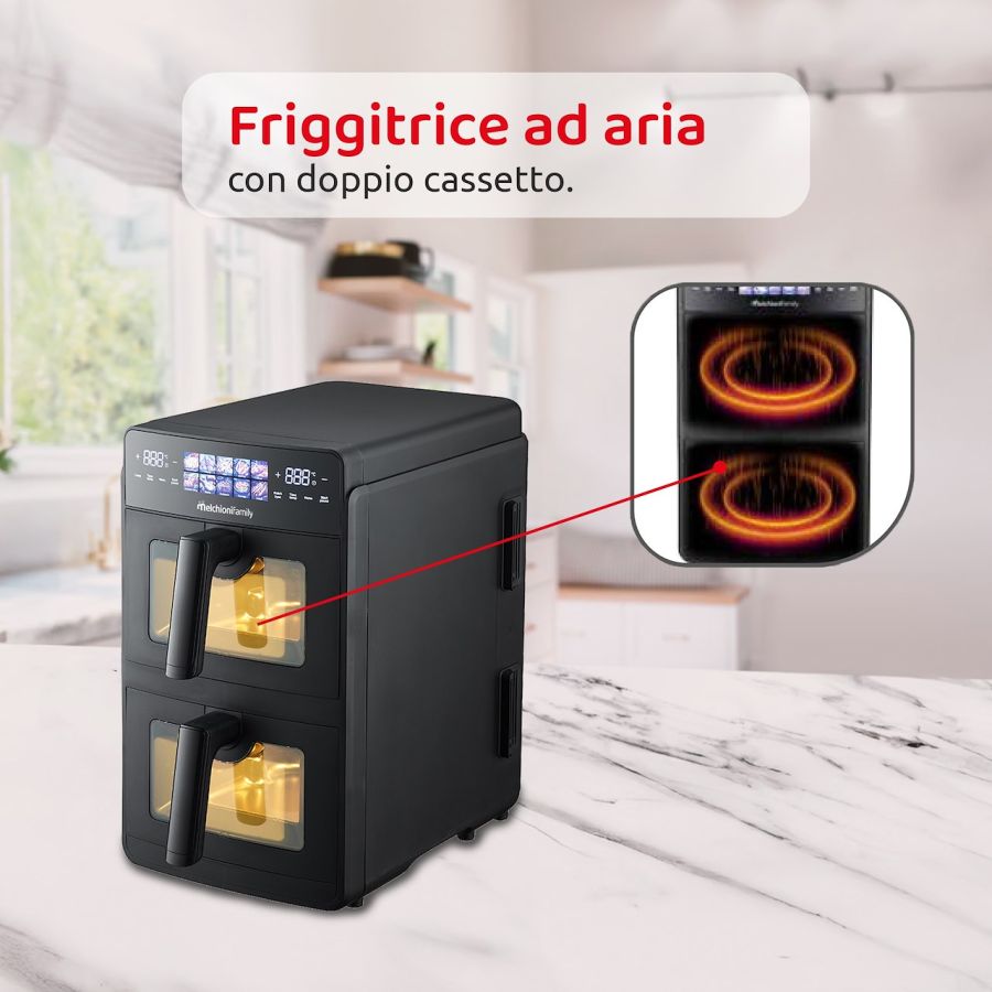 GIULIA | Friggitrice ad Aria 10 L 2.600W, con doppio cassetto verticale (5L + 5L), display a colori GIULIA è la friggitrice ad aria perfetta per chi desidera piatti croccanti e gustosi con meno grassi. Grazie al doppio cassetto da 5L + 5L è possibile cucinare diversi tipologie di cibo in contemporanea con diverse temperature e e tempi di cottura. Inoltre il calore viene distribuito in modo uniforme, garantendo una cottura impeccabile e omogenea. Grande capacità e versatilità: Con un doppio cestello da 5+5 litri, per un totale di 10 litri di capienza complessiva, è ideale per preparare porzioni abbondanti per tutta la famiglia. I 10 programmi preimpostati permettono di cuocere una varietà di piatti con il minimo sforzo. Cottura sana e veloce: La tecnologia ad aria consente di friggere con una riduzione calorica dell?80%, utilizzando poca o nessuna quantità di grassi, rendendo ogni pietanza più leggera e salutare. Controllo intuitivo: Il display LED colorato offre un?interfaccia chiara e moderna, mentre il timer regolabile da 1 a 60 minuti e la temperatura variabile da 80°C a 200°C permettono di personalizzare la cottura secondo le proprie esigenze. Materiali resistenti e facili da pulire: La cavità interna in metallo assicura durabilità e facilità di manutenzione, garantendo prestazioni ottimali nel tempo. Specifiche tecniche: Capacità: 10L doppio cassetto da 5 + 5 litri Doppia resistenza per una cottura uniforme Display LED colorato Cavità interna in metallo Programmi preimpostati: 10 Temperatura regolabile: 80°-200°C Timer: 1-60 minuti Alimentazione: 220-240V AC 50Hz Assorbimento: 2.600W GIULIA| Il gusto autentico della frittura, con il benessere della cottura ad aria!