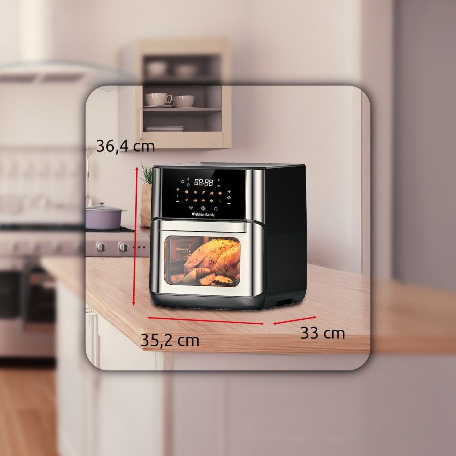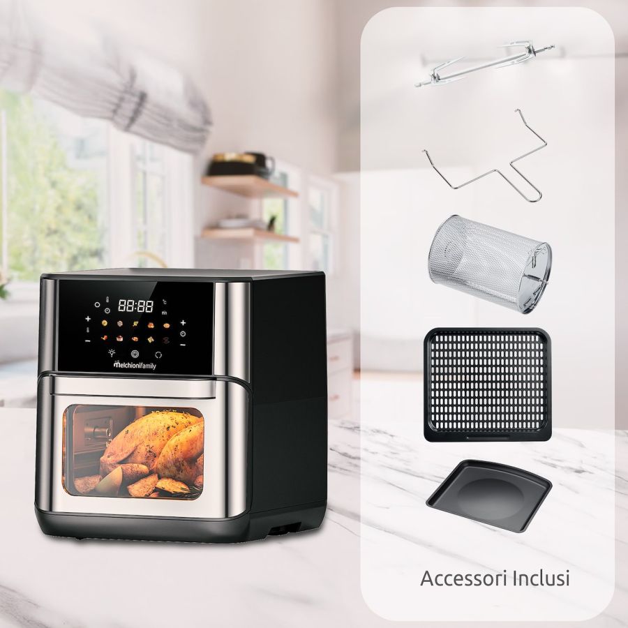 FLORA| Friggitrice ad Aria 12 L Capiente e ad Alte Prestazioni con cestello rotante e girarrosto per la cottura FLORA è la friggitrice ad aria da 12L con sportello perfetta per chi desidera piatti croccanti e gustosi con meno grassi. Grazie agli accessori si possono preparare differenti piatti garantendo una cottura impeccabile e omogenea. Grande capacità e versatilità: Con una capienza da 12 litri, è ideale per preparare porzioni abbondanti per tutta la famiglia. I 10 programmi preimpostati permettono di cuocere una varietà di piatti con il minimo sforzo. Cottura sana e veloce: La tecnologia ad aria consente di friggere con una riduzione calorica dell?80%, utilizzando poca o nessuna quantità di grassi, rendendo ogni pietanza più leggera e salutare. Controllo intuitivo: Il display LED colorato offre un?interfaccia chiara e moderna, mentre il timer regolabile da 1 a 90 minuti e la temperatura variabile da 80°C a 200°C permettono di personalizzare la cottura secondo le proprie esigenze. Materiali resistenti e facili da pulire: La cavità interna in metallo assicura durabilità e facilità di manutenzione, garantendo prestazioni ottimali nel tempo. Specifiche tecniche: Capacità: 12L Display LED colorato Cestello Girevole, girarrosto, cestello quadrato, teglia Cavità interna in metallo Programmi preimpostati: 12 Temperatura regolabile: 80°-200°C Timer: 1-90 minuti Alimentazione: 220-240V AC 50Hz Assorbimento: 1.800W FLORA| Il gusto autentico della frittura, con il benessere della cottura ad aria!