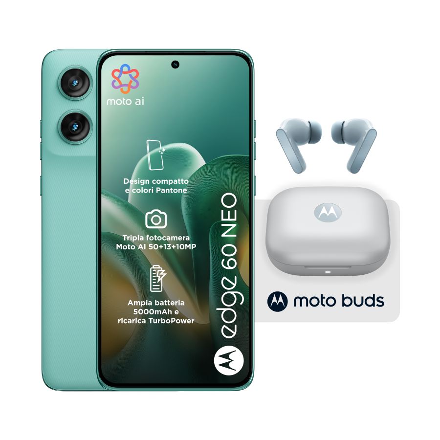 GSM/UMTS/HSDPA Motorola EDGE60FMO EDGE 60 NEO 256 FRO+MOTOB DITLPMOTEDGE60FMOTi presentiamo Motorola Edge 60 Neo, dal design compatto ed elegante e con protezione avanzata di livello militare. Scatta immagini eccezionali ovunque grazie al sistema di fotocamere Sony LYTIA? 700C da 50 MP potenziato da Moto AI. Goditi i contenuti sullo schermo Super HD da 6,4", ultra luminoso. La ricarica TurboPower? da 68W fornisce autonomia rapidamente. Fai spiccare ogni dettaglio con Motorola Edge 60 Neo con l?aggiunta di moto buds. Gli auricolari con ampio driver dinamico e audio ad alta risoluzione che esaltano la qualità di ogni suono. Lasciati avvolgere dai tuoi film e brani musicali preferiti con audio bilanciato di alta qualità e bassi ancora migliori. Escludi il mondo attorno a te o mantieni la percezione dell'ambiente che ti circonda durante l'ascolto con l'eliminazione attiva e dinamica del rumore. Goditi chiamate vocali nitidissime grazie al sistema con tre microfoni su ogni auricolare. Configura, personalizza e controlla la tua esperienza di ascolto in tutta semplicità. La differenza si sente forte e chiaro con moto buds.