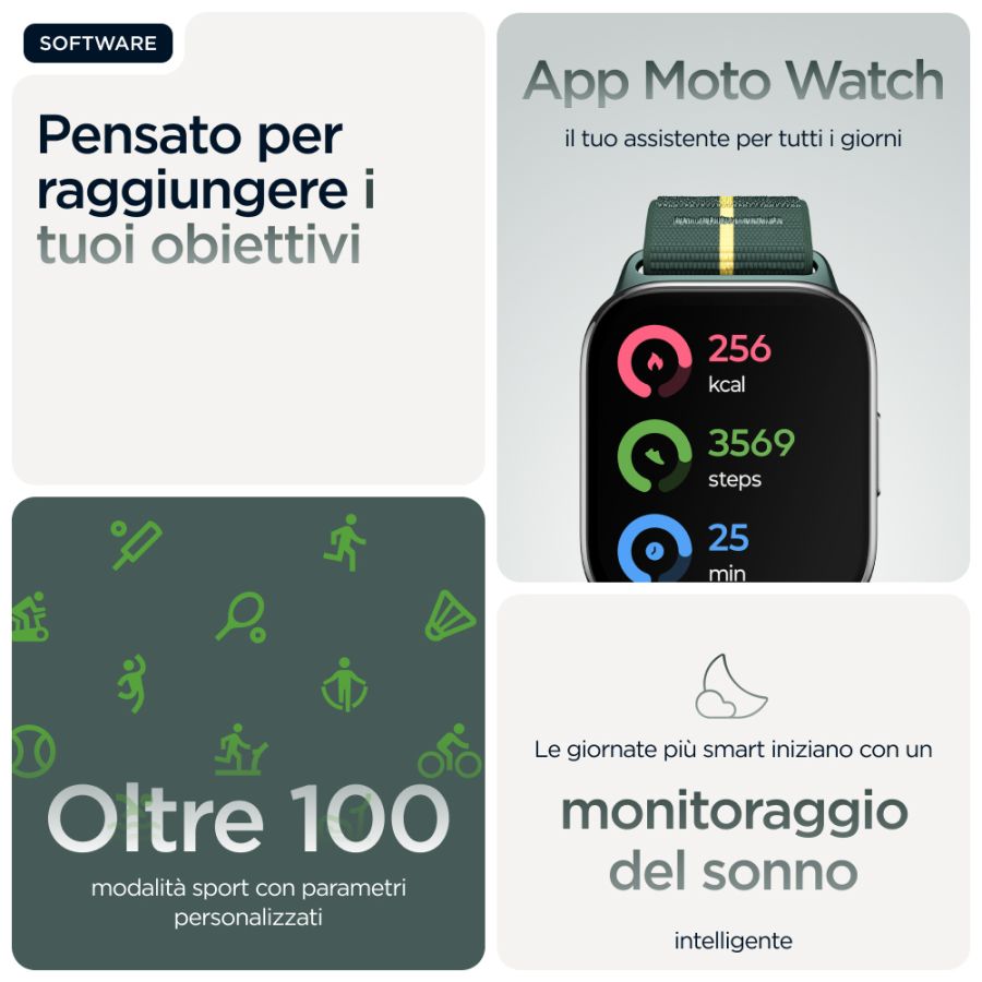 Finalmente uno smartwatch che oltre ad aiutarti a restare in forma fa anche una dichiarazione di stile. Ti presentiamo Moto Watch Fit. Usa il grande e luminoso schermo OLED da 1,9 pollici per interagire perfettamente con le tue statistiche e attività. Goditi un design elegante, moderno, ultrasottile e leggero e una gamma di cinturini, in un colore Trekking Green selezionato da Pantone®, o scegli tra un numero in crescita di cinturini compatibili(1), oltre a una serie di quadranti.(2) Mantieni il controllo con l'eccezionale integrazione Android(2), che tu stia saltando una canzone o ricevendo delle notifiche. Migliora le tue prestazioni con il monitoraggio avanzato di fitness e salute. Proteggi il tuo orologio con la protezione per l'immersione in acqua IP68, una resistenza alla pressione di 5 ATM e Corning® Gorilla® Glass 3.(3) Approfitta di fino a 16 giorni di durata della batteria(4), per goderti le tue attività senza interruzioni. Moto Watch Fit è smart in tutti i sensi.