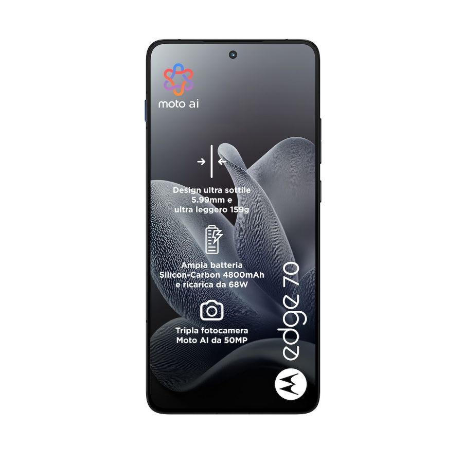 Presentazione del nuovo e incredibilmente sottile Motorola Edge 70. Realizzato in alluminio aeronautico con finiture esclusive e colori Pantone®, reinventa le capacità di uno smartphone ultrasottile. I tre obiettivi da 50 MP, la potenza di Moto AI, i colori e le tonalità della pelle Pantone? Validated ti permettono di ottenere risultati straordinari a ogni scatto.(1) Inoltre, la nuova batteria al silicio-carbonio alimenta le tue avventure quotidiane, senza rinunciare al design elegante. Non lasciarti ingannare dall'eleganza. Questo telefono è resistentissimo. Protezione subacquea e resistenza di standard militare.(2, 3) Guarda tutto con dettagli mozzafiato sullo schermo Super HD (1220 p / 1,5 K) da 6,7". Goditi le potenti prestazioni di Snapdragon® 7 di 4ª generazione e il grandissimo spazio di archiviazione. Accetta tutte le sfide con Motorola Edge 70.