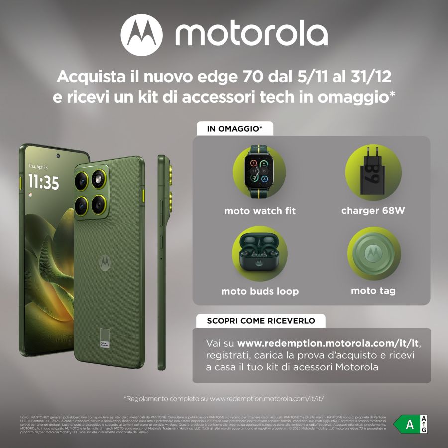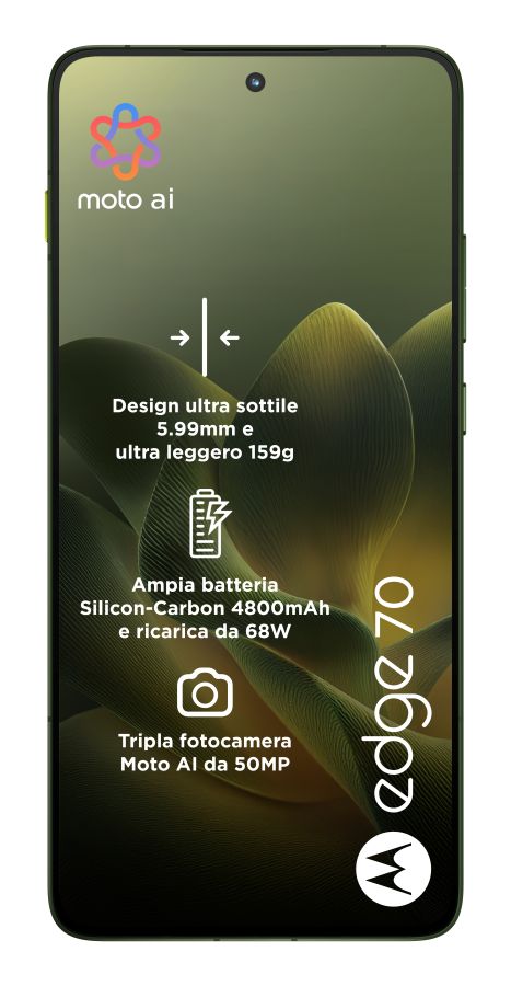 GSM/UMTS/HSDPA Motorola Smartphone Motorola EDGE 70 Tim Pantone bronze green 12BB0981023Ti presentiamo Motorola Edge 70, dal design ultra sottile 5.99mm e ultra leggero 159g con protezione avanzata Military Standard e resistenza IP68 e IP69. Scatta immagini eccezionali grazie al sistema di fotocamere da 50 MP OIS e ultragrandangolare. Goditi i contenuti sull?ampio display Super HD da 6,67?. La ricarica TurboPower? da 68W fornisce autonomia rapidamente. Prova performance rapide ed efficienti con la batteria Silicon-Carbon da 4800mAh e il processore Qualcomm Snapdragon® 7 Gen 4. Con 12GB di RAM e 512GB di memoria.